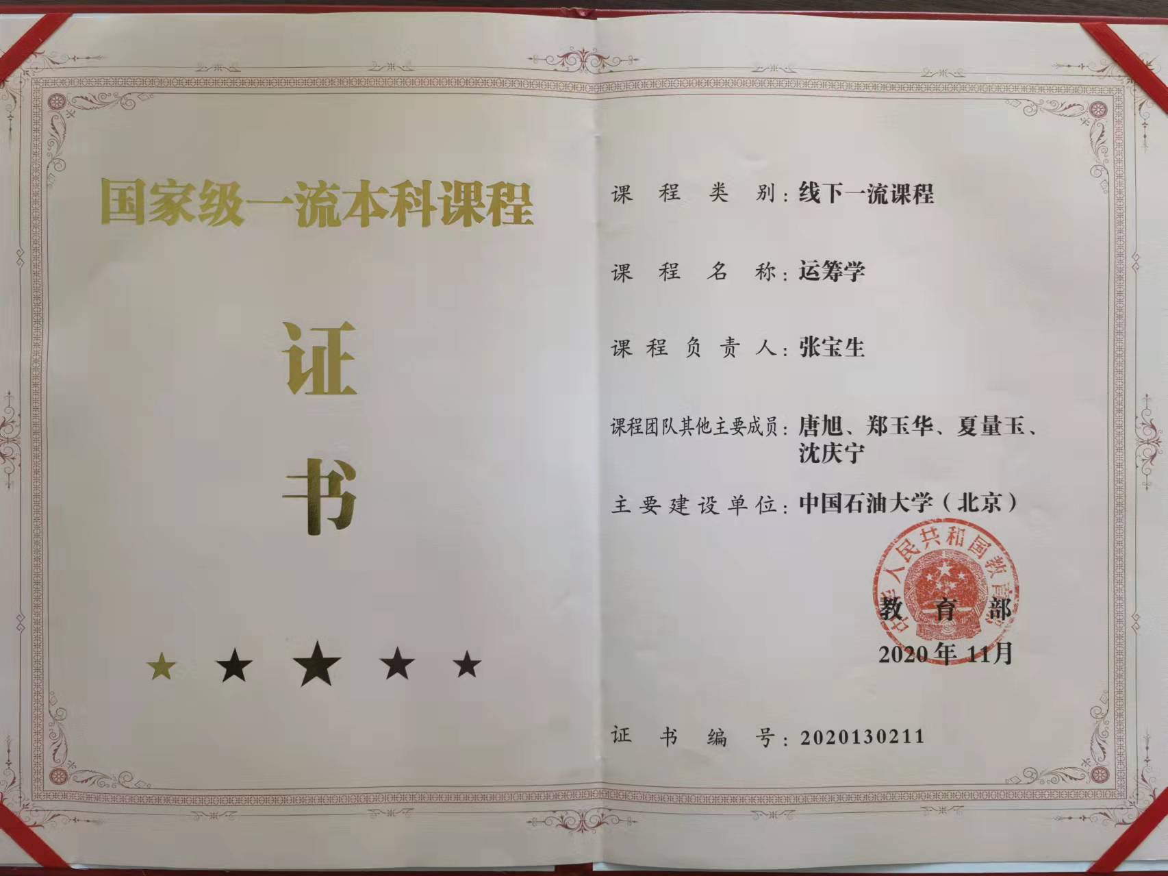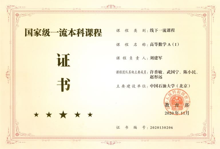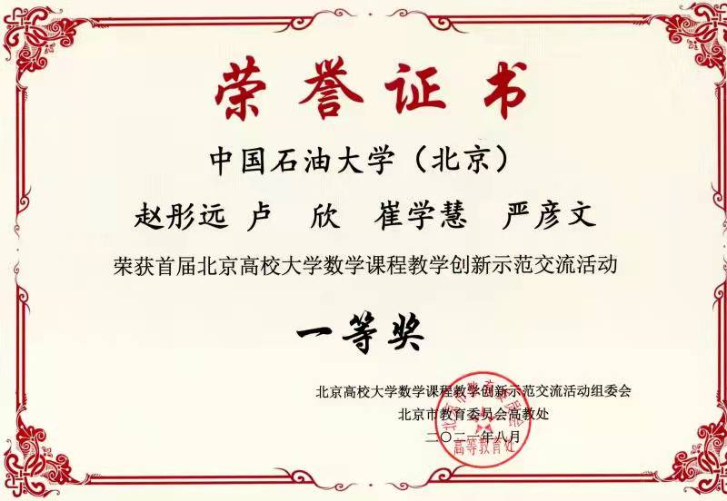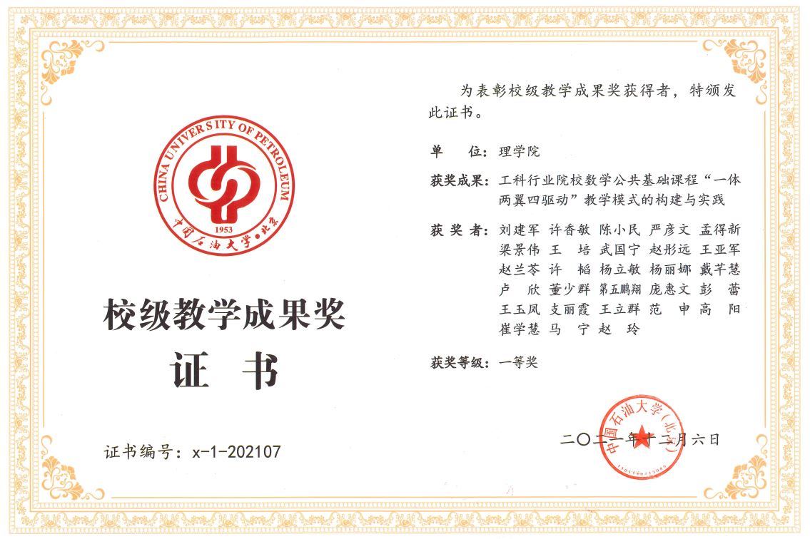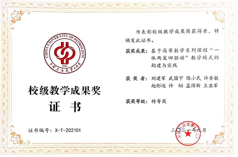 基于“一体两翼四驱动”的教学模式建设的高等数学A(I)于2020年获批国家级一流本科课程,为行业院校数学公共基础课程的一流本科课程建设提供了示范。线性代数和概率统计2021年获校“金质优课”。