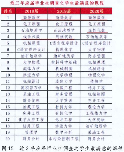 学校近三届毕业生最满意课程问卷调查结果中,高等数学连续三届位列榜首,线性代数、概率统计连续两届入榜。