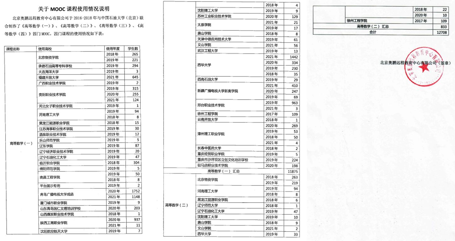 高等数学MOOC除我校学生外,已为国内45所高校12700余名学生使用;三门课程MOOC平台近3年每年总浏览量达500多万人次;