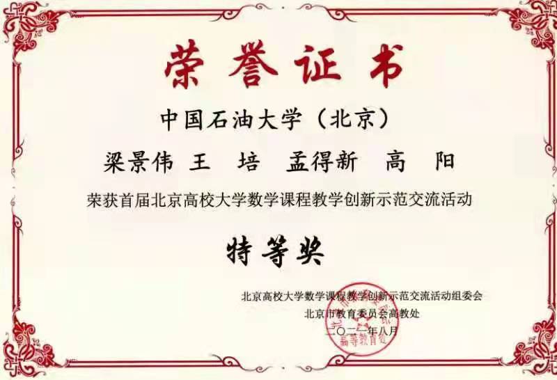 2021年5月中国石油大学(北京)承办北京高校数学教学论坛,论坛上刘建军、王培、赵彤远三位老师针对“一体两翼四驱动”教学模式作报告,受到与会高校代表的广泛关注和高度认可。