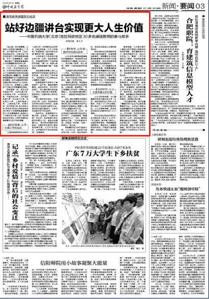 5月15日《中国教育报》以《共绘新时代教育援疆画卷》为题报道了16所教育部直属高校的30多名教师来到中国石油大学(北京)克拉玛依校区,对口支援校区建设的事迹后,7月11日,《中国教育报》再次以《站好边疆讲台实现更大人生价值》为题报道了中国石油大学(北京)克拉玛依校区30多名援建教师的奋斗故事,教育部官网新闻专栏“聚焦教育援疆系列报道”也作了发布。