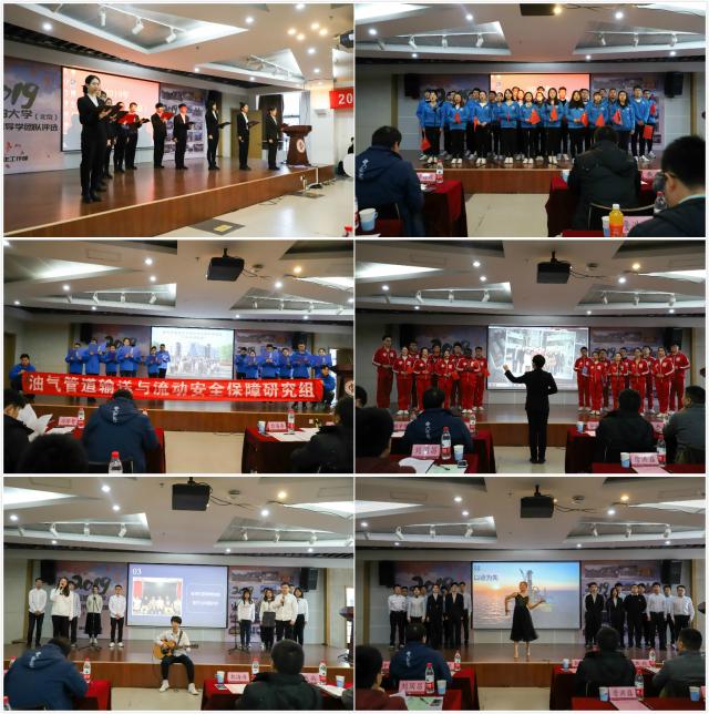 评审现场,18个候选团队依次进行了视频汇演,对团队在政治建设、文化建设、科研创新等方面取得的成果进行了详细介绍,并运用诗歌朗诵、大合唱、情景歌舞、乐器演奏等多种艺术形式现场展现了团队风采。综合视频汇演和现场表现,石油分子表征与高效清洁利用团队、高压水射流钻井与完井创新团队、油气管道输送与流动安全保障团队、海洋工程团队、稠油降黏机理团队、非常储能团队、非常规油气成藏与地质评价团队、513seminar团队、油气成藏与资源评价团队、能源市场与环境经济团队等十个团队最终获评2019年研究生优秀“导学团队”。石油分子表征与高效清洁利用团队获“最佳团建”奖,能源市场与环境经济团队获“最佳人气”奖。