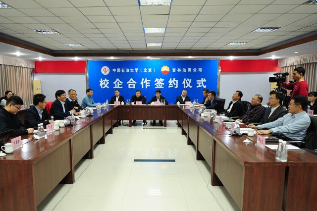 王峰对李根生一行来访表示欢迎,感谢中石大多年来在人才、技术、勘探开发业务等方面给予吉林油田的大力支持。他说,吉林油田已进入勘探开发中后期,老油田区块面临“双高”“双低”“双负”等现实情况,常规资源已演变为“非常规资源”,动用难度很大;同时,近几年公司勘探开发的重点放在非常规领域,致力于开发页岩油、致密油、致密气等。这些低品位油气资源的提产、稳产和降本增效面临着很多技术挑战,迫切需要与中石大加强科技合作。解决吉林油田的非常规资源开发问题具有战略意义,所取得的成功经验辐射面会很大;企校实践基地的建立,有利于拓展学生视野,双方发挥各自优势,深入合作,定会取得丰硕成果。李根生重点介绍了近年来学校的办学情况,他表示,双方合作基础良好,合作前景广阔,应以签订合作协议、共建研究生联合培养基地和非常规油气研究实验室为契机,围绕油田生产遇到的技术难题,加强科技合作,在解决实际问题的同时,形成专利、论文、省部级以上奖励等有显示度的成果;继续加强油田在职人员培训和骨干技术人员的学历提升;加强实验室共建,促进实验室由评价型向研发型转变;加强国际合作,共同承办国际会议,开展国际学术交流。