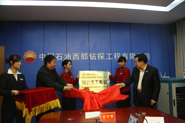 10月8日下午,中国石油大学与中国石油集团西部钻探工程有限公司(以下简称西部钻探公司)全面合作协议签字暨“研究生工作站”揭牌仪式在乌鲁木齐西部钻探公司办公楼举行。校长张来斌、西部钻探公司总经理马永峰先后讲话并代表双方在合作协议上签字,并为“研究生工作站”揭牌。签字仪式由西部钻探公司党委书记韩炜主持。