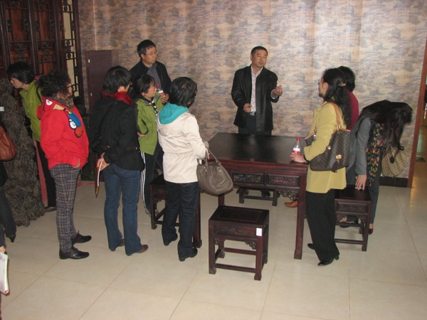 在总经理吴新建的带领下,大家对劲飞红木家具厂进行了参观。在参观过程中,吴新建向大家详细介绍了辨别海南黄花梨、印度小叶紫檀、老挝红酸枝等多种名贵树种的基本知识以及我国明清古典家具的不同风格和特点。大家还参观了红木家具开料,雕刻,组装,和打磨车间,亲眼看到了整个红木家具的工艺制造过程。通过参观,大家认识到,红木家具是我国的历史文化及工人的精湛技艺完美结合,对大自然赋予人类的财富和人类的聪明智慧无不感叹。