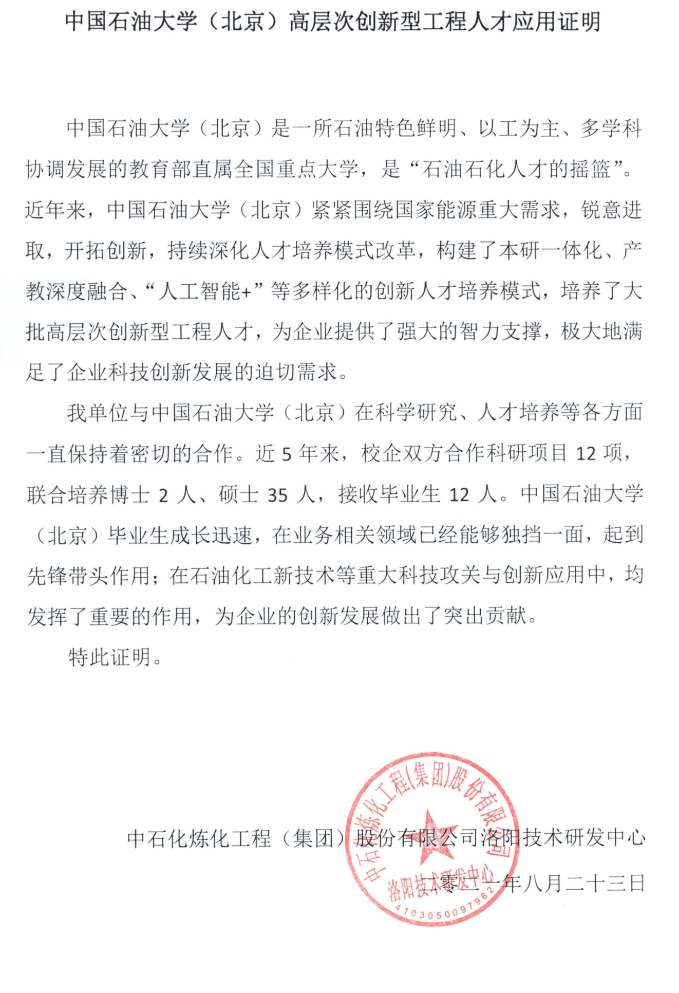 5.中石化炼化工程公司洛阳技术研发中心人才应用证明