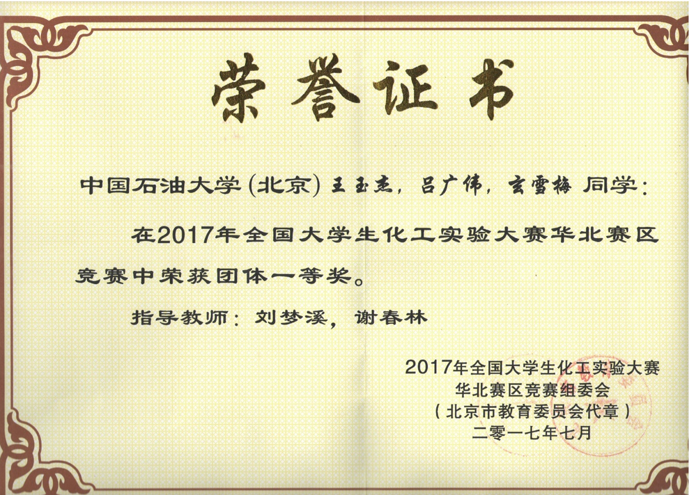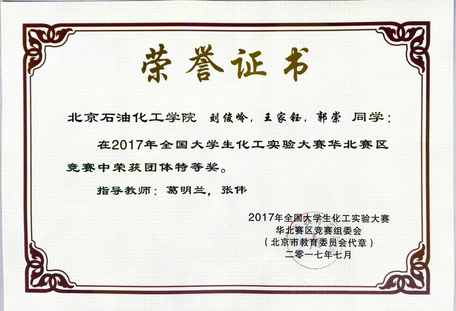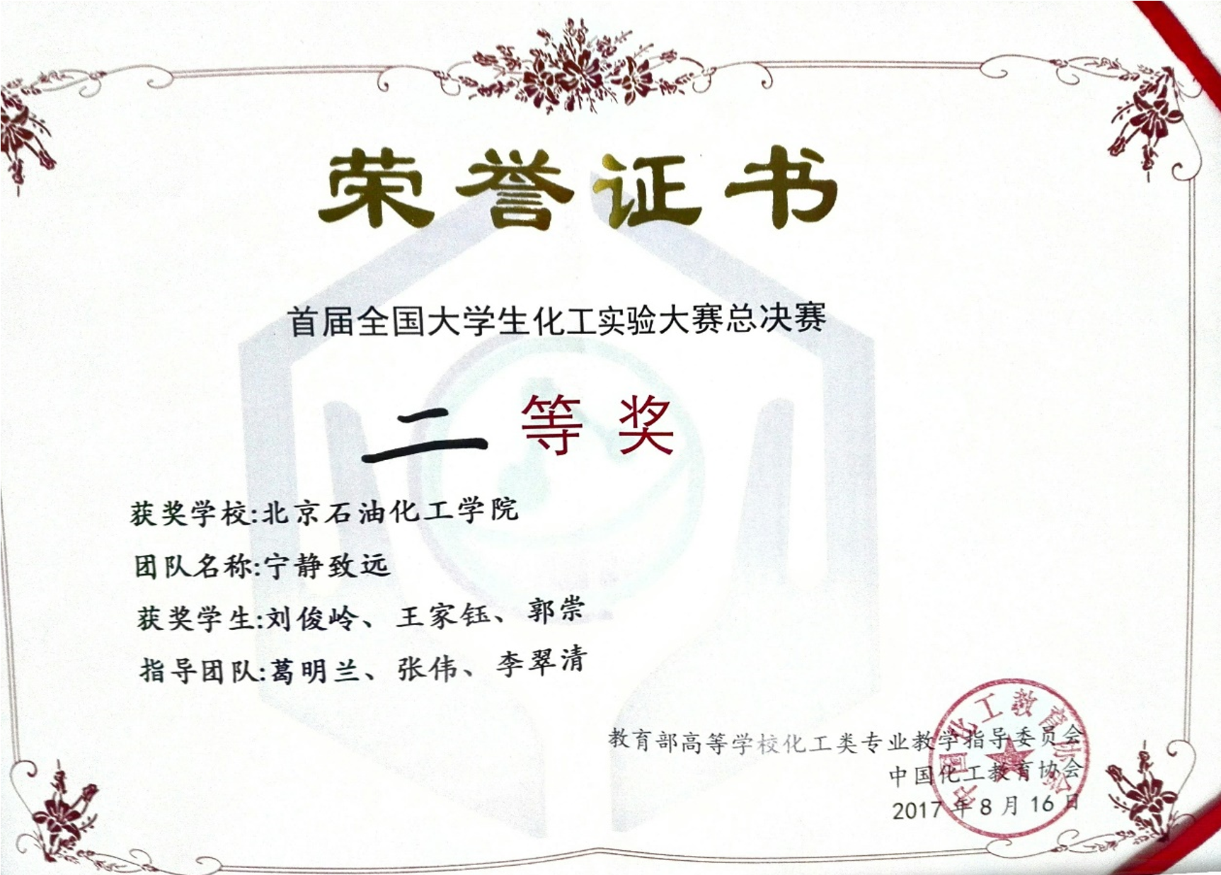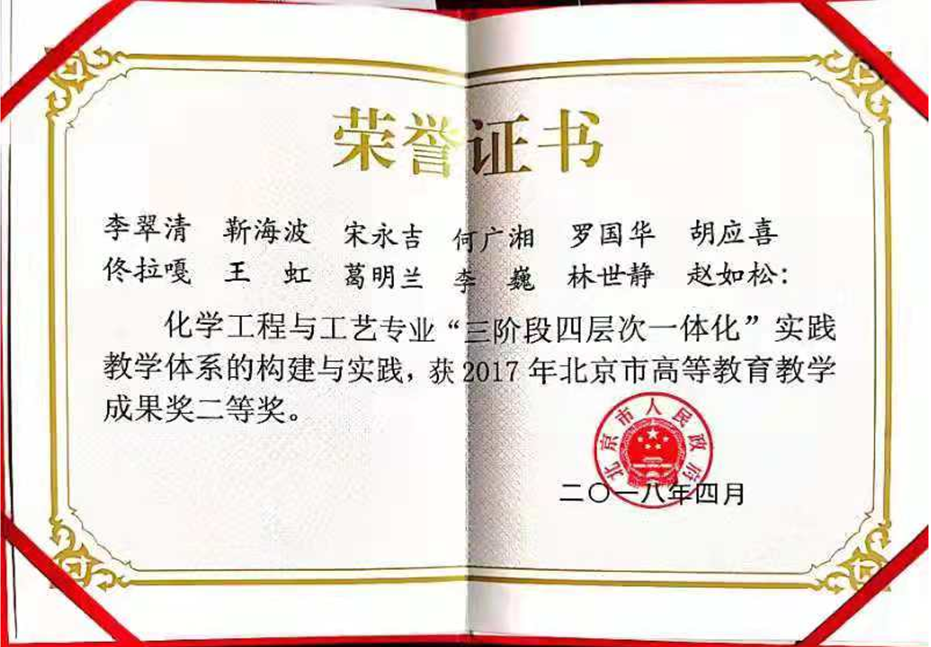竞赛:参加北京市大学生化工原理竞赛和华北区、全国化工实验大赛,近五年获奖137项,其中全国奖励4项(一等奖1项,二等奖3项),华北区15项,北京市118项)。