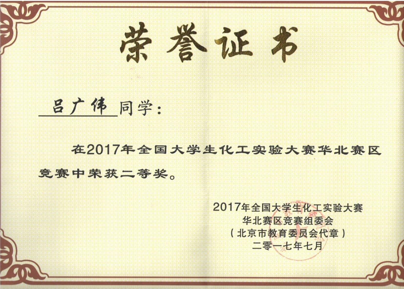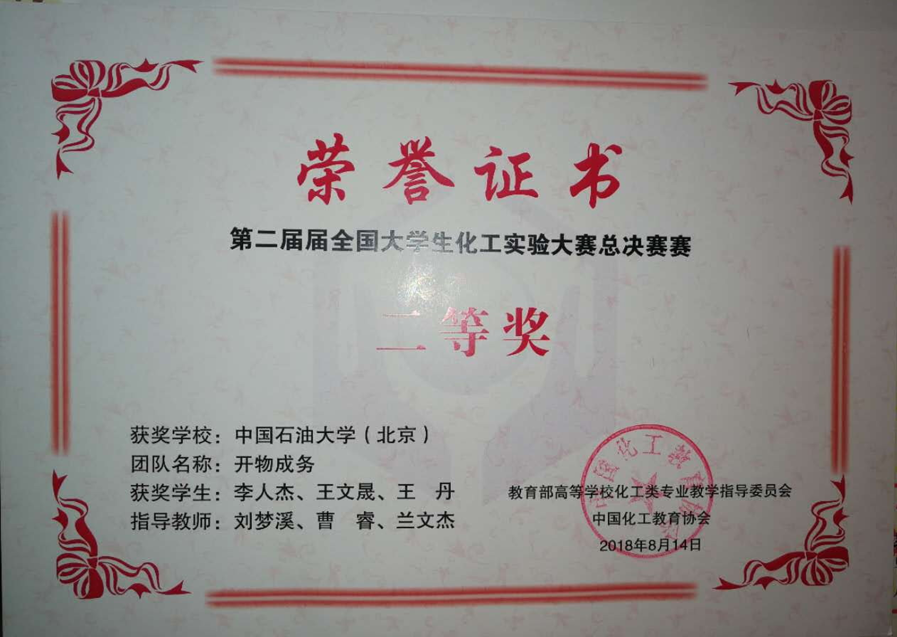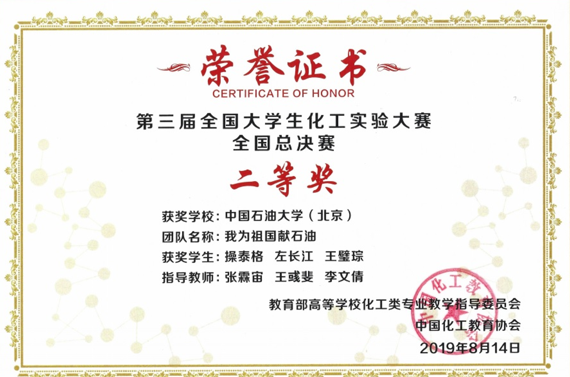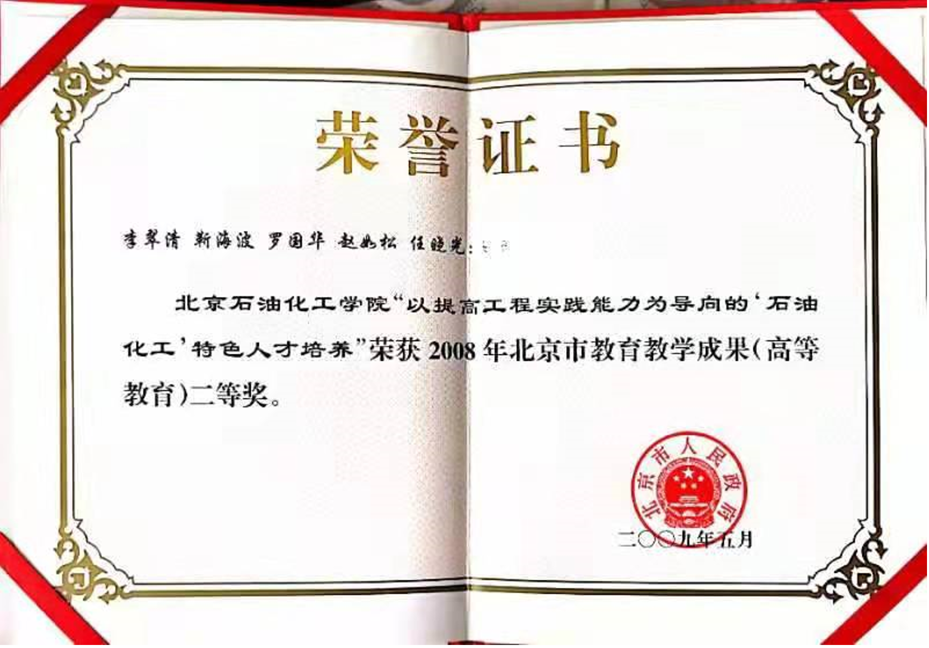 竞赛:参加北京市大学生化工原理竞赛和华北区、全国化工实验大赛,近五年获奖137项,其中全国奖励4项(一等奖1项,二等奖3项),华北区15项,北京市118项)。
