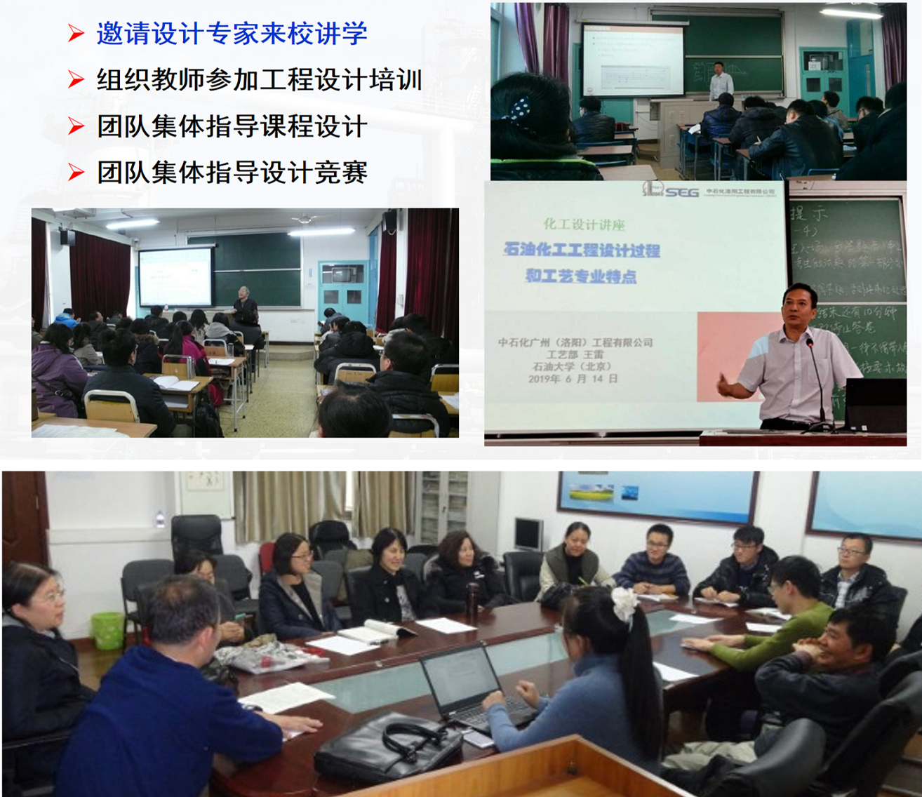 ③ 建立能激发学生创新思维的工程能力培训体系,从多层面强化组建高水平工程师资队伍。通过综合性工程实践、自主式研究,给学生提供解决复杂工程问题的锻炼机会;在课堂/实验/实践环节中体现现代能源工程特色,将培养学生专业兴趣和工业生产有机对接;积极开展“石油特色的工程思政教育”,使学生以刻苦求学和实业兴国为荣。团队也特别注重高校间的教学研讨和校企间的工程交流,通过邀请设计院和企业专家定期讲座、培训和团队内以老带新建立教师工程能力培养模式,鼓励教师积极参与产学研结合的科研项目锻炼,快速提升青年教师的工程教学能力。