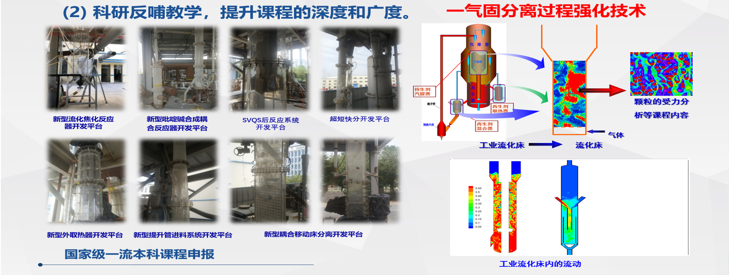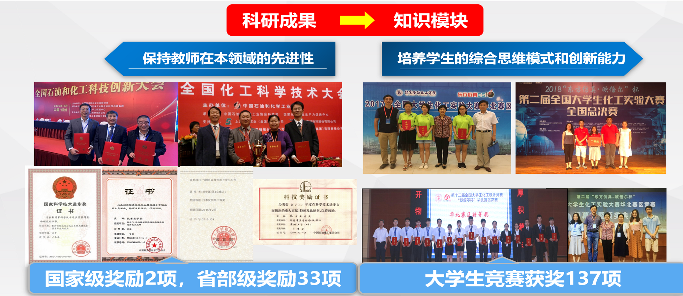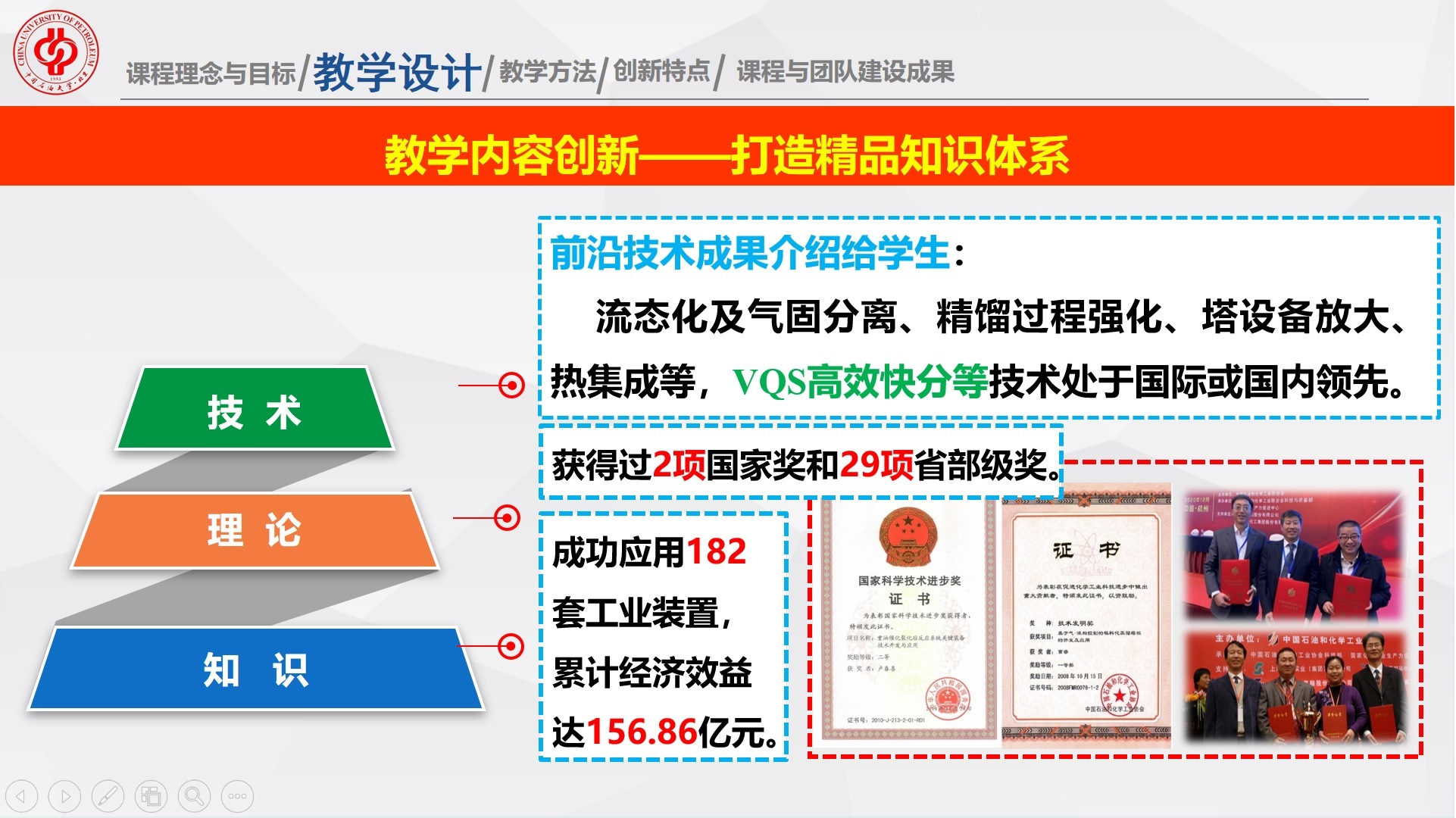 教学体系针对工业生产的“卡脖子”问题,兼顾能源化工领域的发展和转型。在一流科研平台支撑下,将团队多年来积累的科技成果(2项国家奖和35项省部级奖)融入教学,形成具有科学性和实用性的知识模块,如:流态化及气固分离、精馏过程强化、塔设备放大及增效、VOCs减排等,多项成果处于国际或国内领先。以高新科技引领工程教育,成为学生获取前沿知识、提升工程能力最有效的手段。