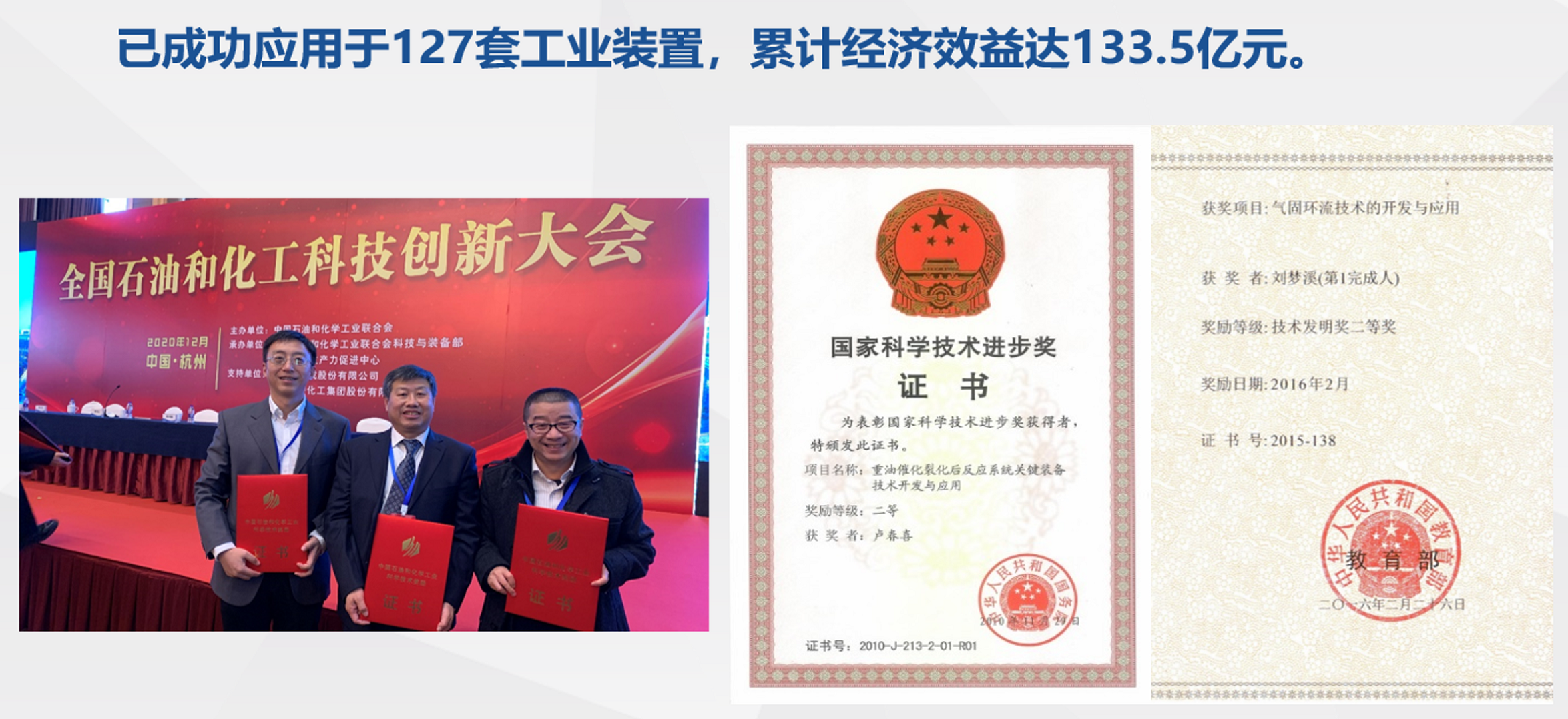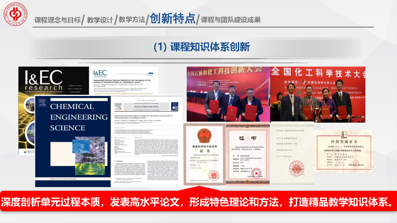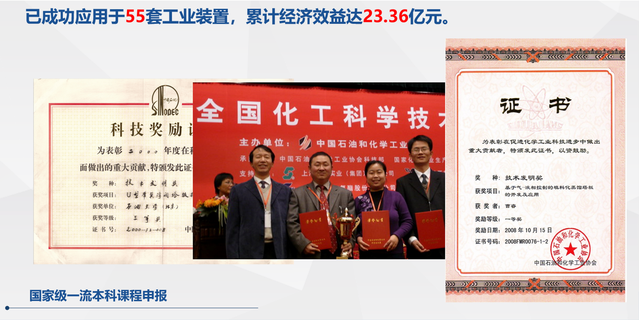 教学体系针对工业生产的“卡脖子”问题,兼顾能源化工领域的发展和转型。在一流科研平台支撑下,将团队多年来积累的科技成果(2项国家奖和35项省部级奖)融入教学,形成具有科学性和实用性的知识模块,如:流态化及气固分离、精馏过程强化、塔设备放大及增效、VOCs减排等,多项成果处于国际或国内领先。以高新科技引领工程教育,成为学生获取前沿知识、提升工程能力最有效的手段。