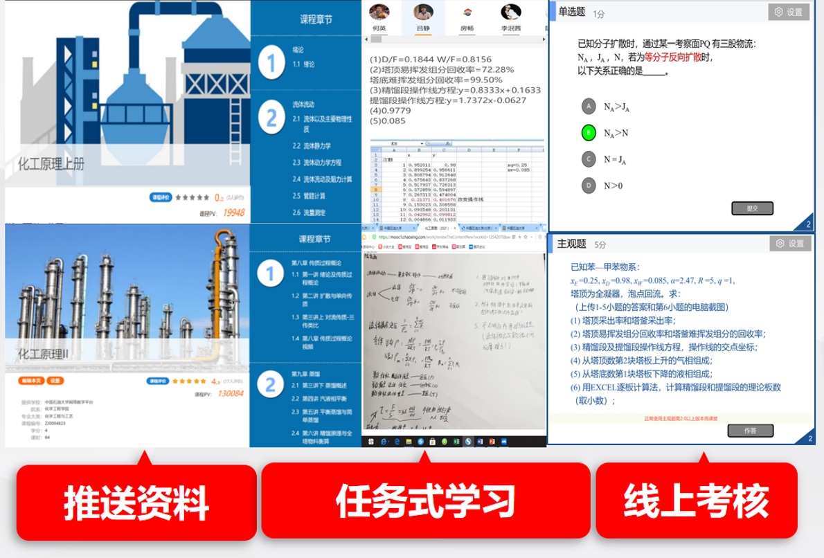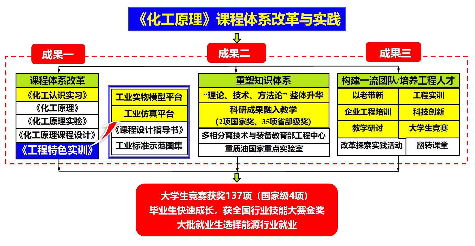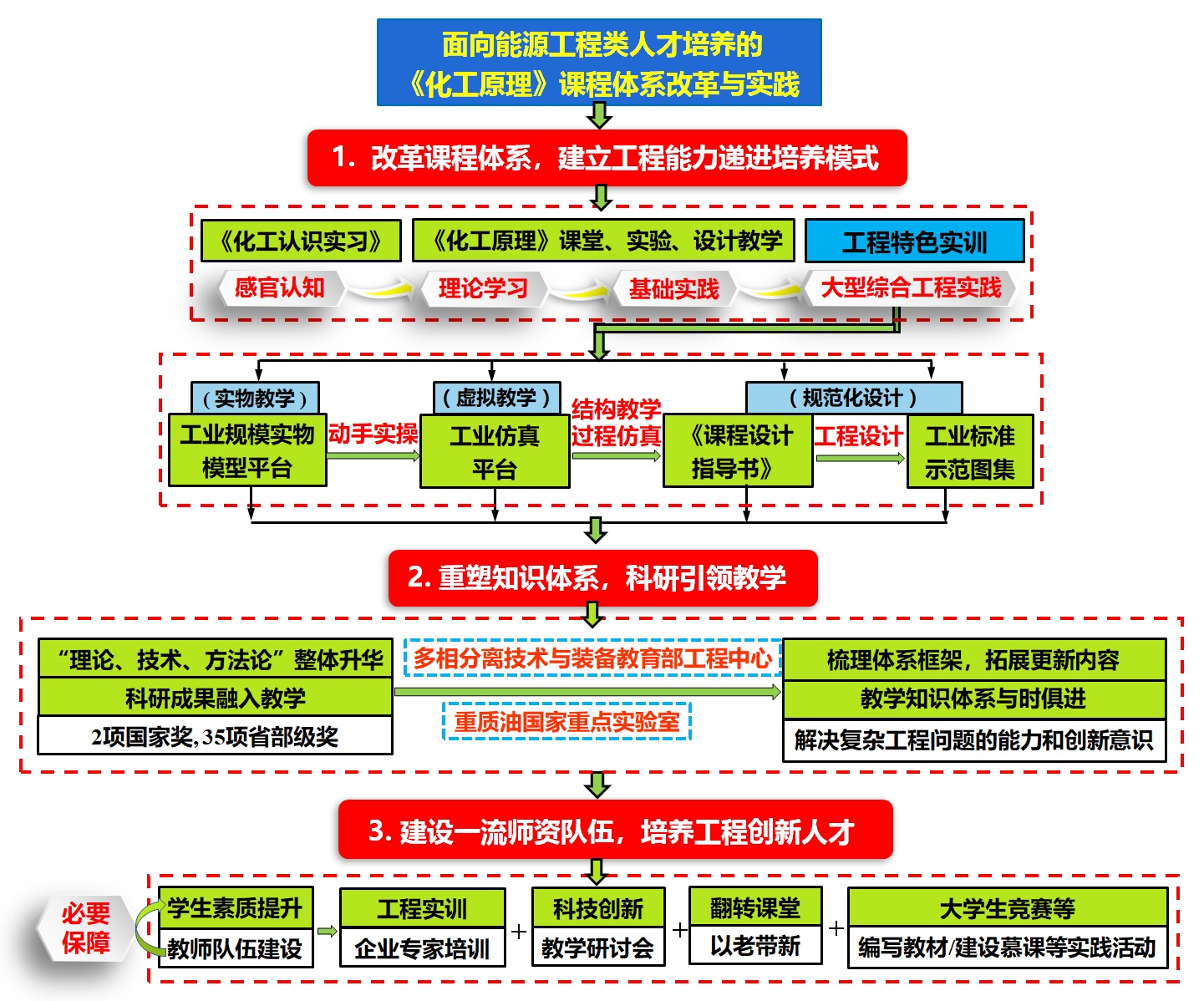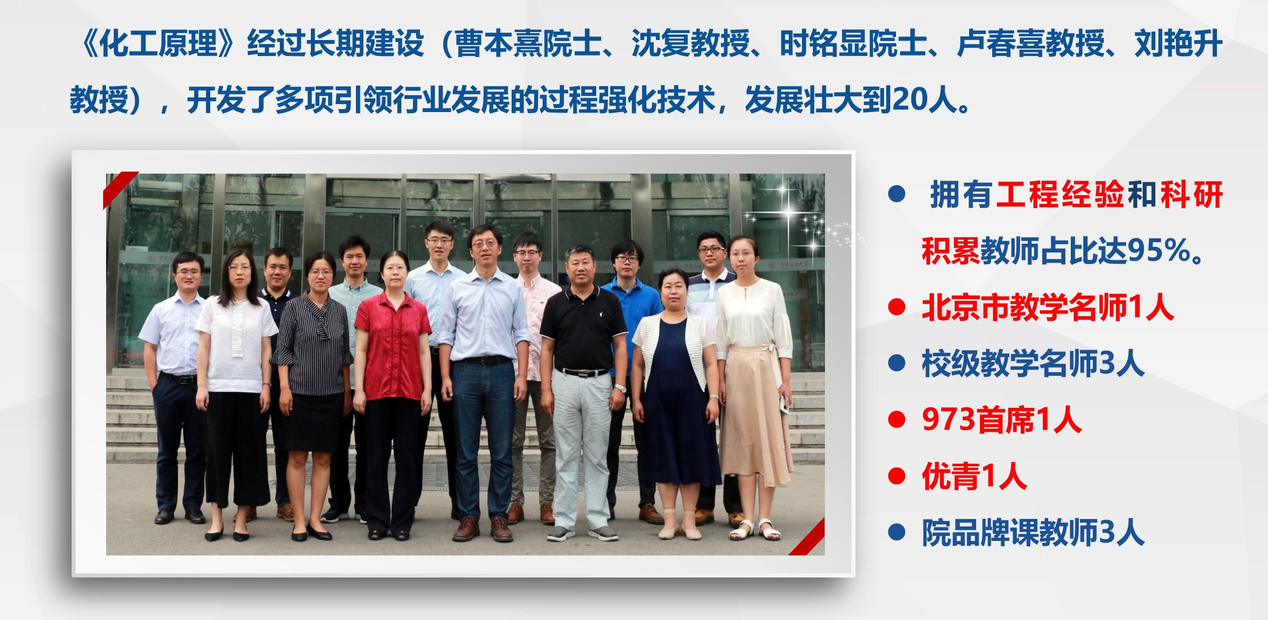 团队拥有北京市教学名师、973首席、优青等高层次人才,在“多相分离技术与装备教育部工程中心”和“重质油国家重点实验室”平台支撑下,将科研成果转化为精馏及塔器、流态化及气固分离等教学模块,以VQS高效快分等最新专业技术充实教学内容,以“场-流”、“相控制”理论等重新认识单元过程本质和传递普遍规律,使学生获取一流学科知识。新体系直接针对工程“卡脖子”问题,树立前瞻性科学思想,成为工程教育改革的重要举措。