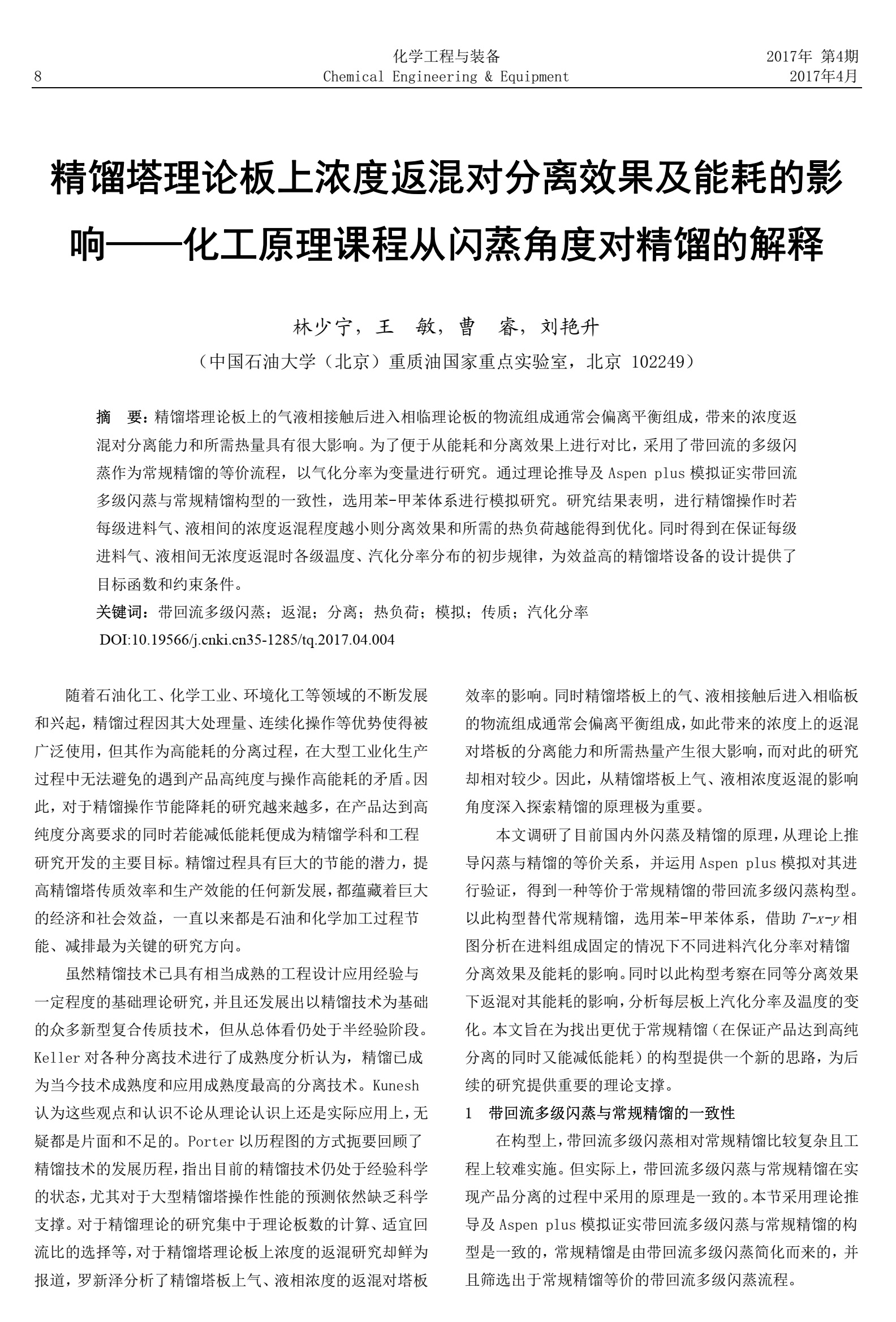 ② 提出精馏过程中回流的“热”含义,解释最小回流比、“夹点”概念、建立塔板热状态方程,领悟供能/分离原理。