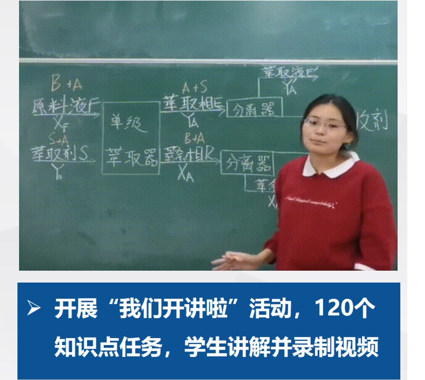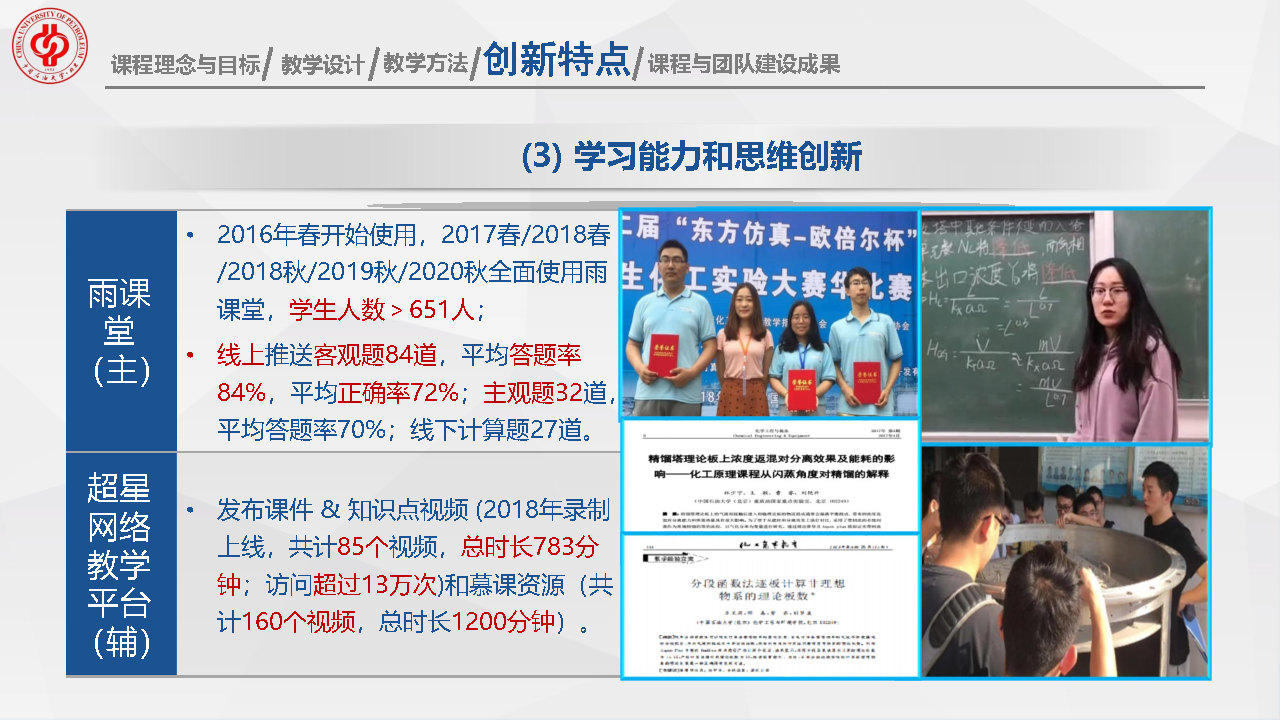 ② 提炼单元过程的创新理论,以科研优势领航教学知识体系,打造石油特色教学精品。通过“场-流”理论、“相控制”理论抽提单元过程的本质内涵;将雄厚的科研成果(2项国家奖和35项省部级奖)转化为紧跟能源行业导向的实用型教学资源优势,创立传质、流态化及气固分离、热集成等单元过程强化技术;将“工装一体化”思想和解决工程放大的“相似论”等工程研究方法论以及类比、演绎等学习方法论引入教学。改革通过以长期积累的创新理论、前沿知识、高新技术和实用方法论重塑知识模块,实现单元过程知识体系的整体升华。