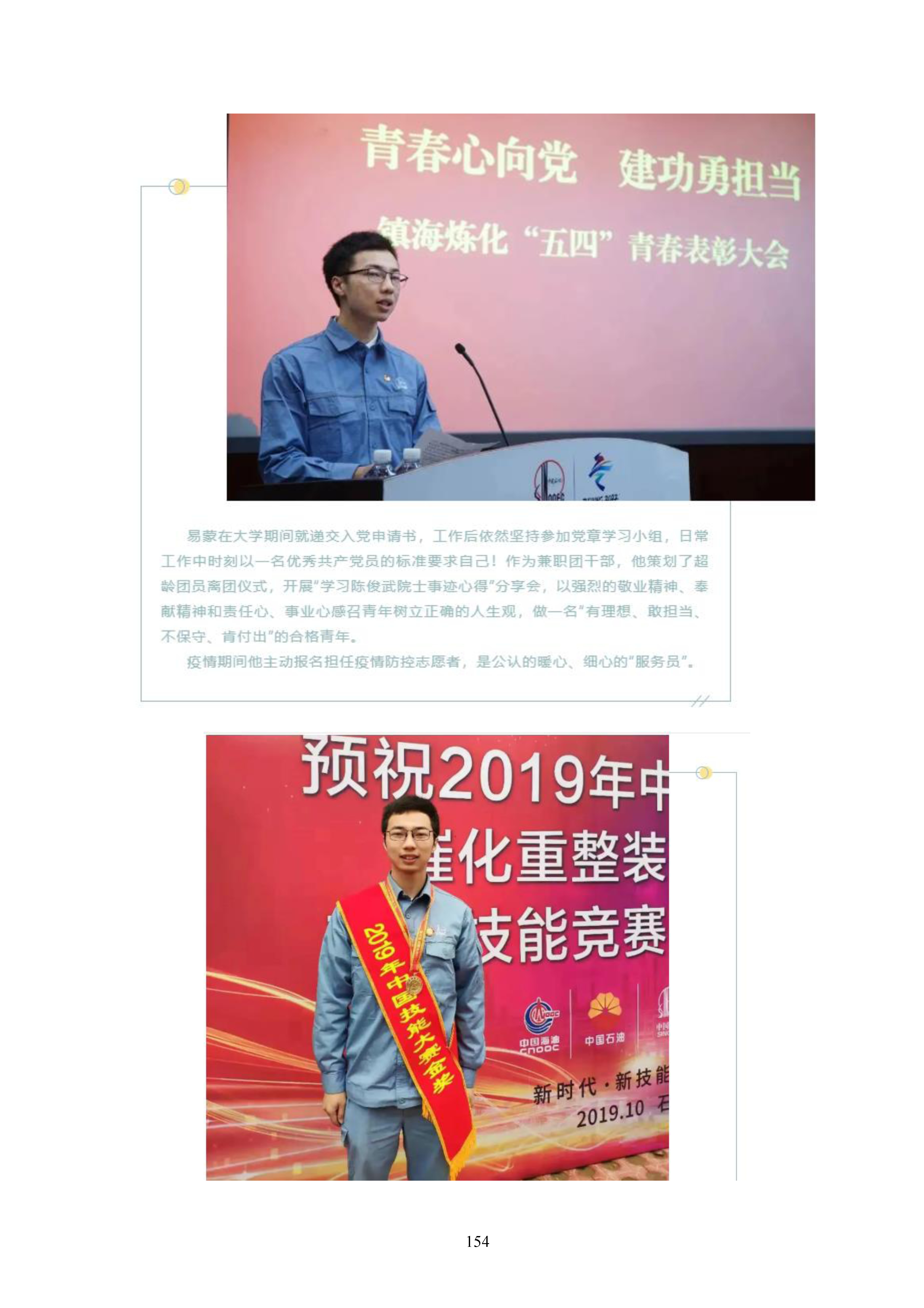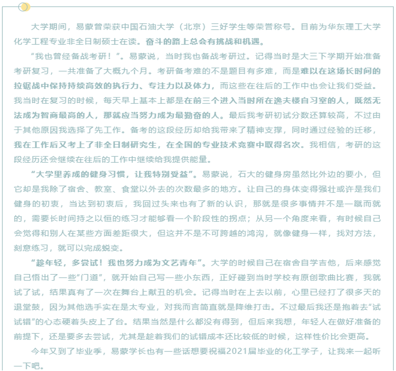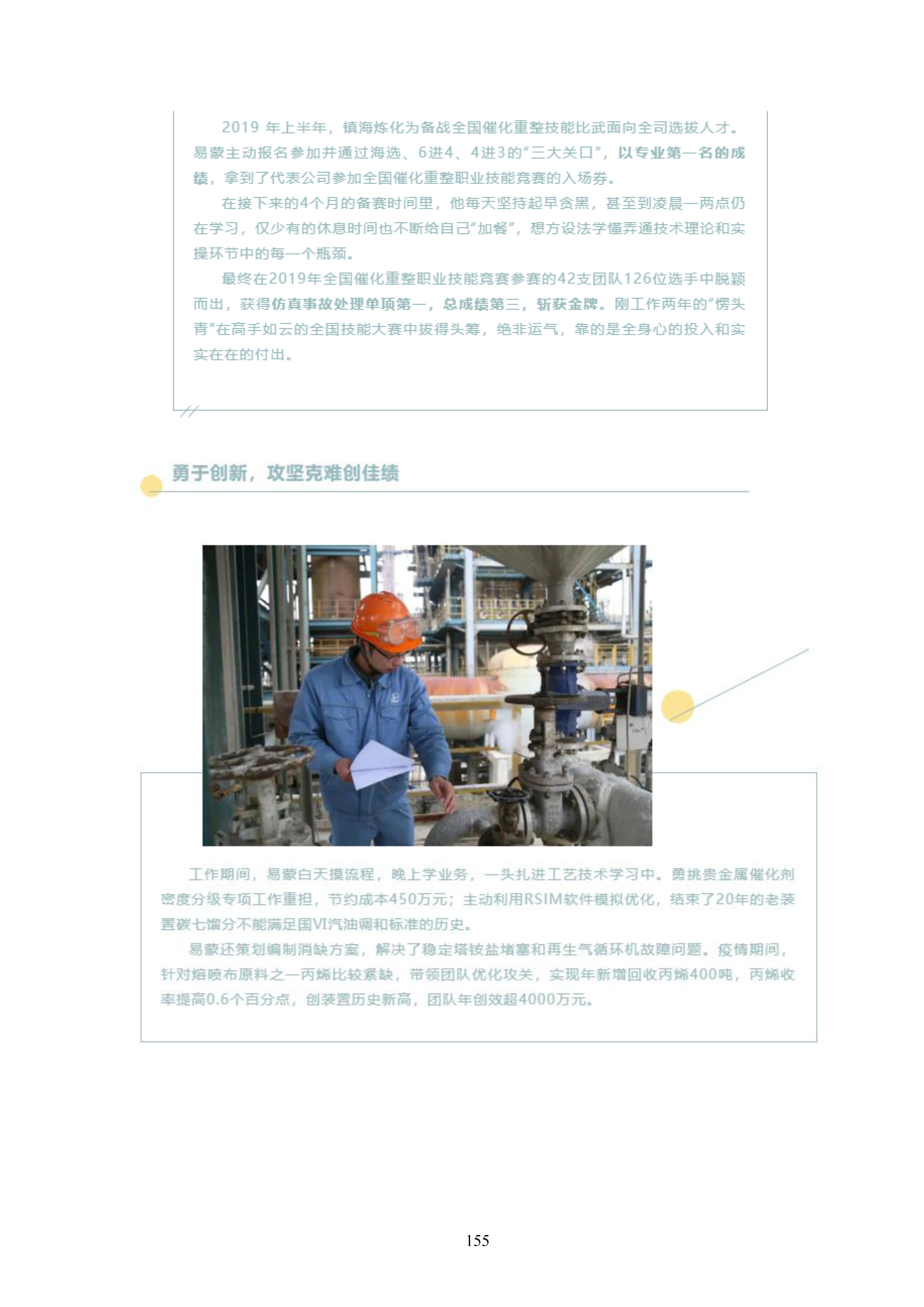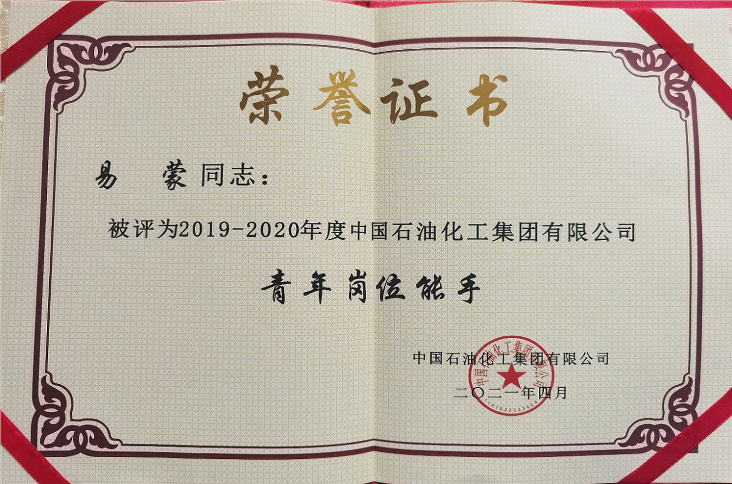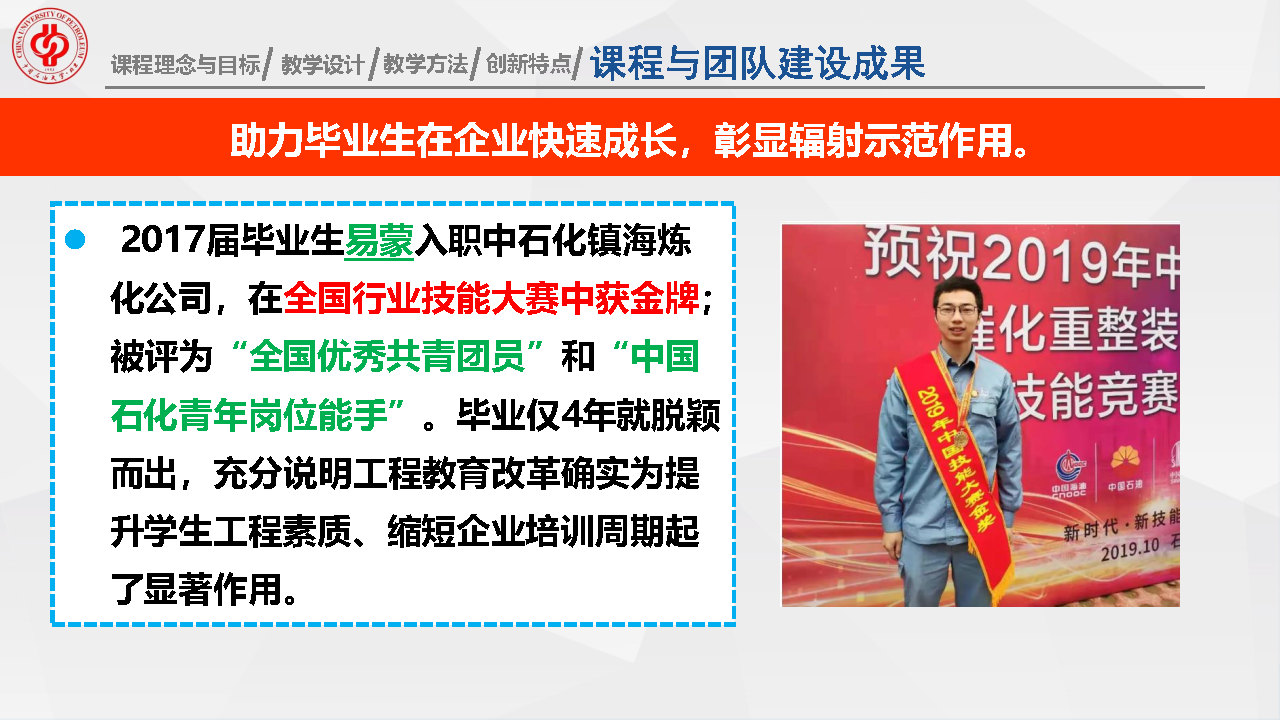 入职中石化镇海炼化公司,2019 年在全国催化重整职业技能大赛中获金牌;被评为“中国石化青年岗位能手”,2021年被评为“全国优秀共青团员”。2019年承担贵金属催化剂密度分级工作,节约成本450万元;利用RSIM软件模拟优化,结束了20年老装置碳七馏分不满足国Ⅵ汽油调和标准的历史。解决了稳定塔铵盐堵塞和再生气循环机故障问题。他毕业仅4年就脱颖而出,充分说明工程实训确实为提升学生工程素质、缩短企业培训周期起了显著作用。