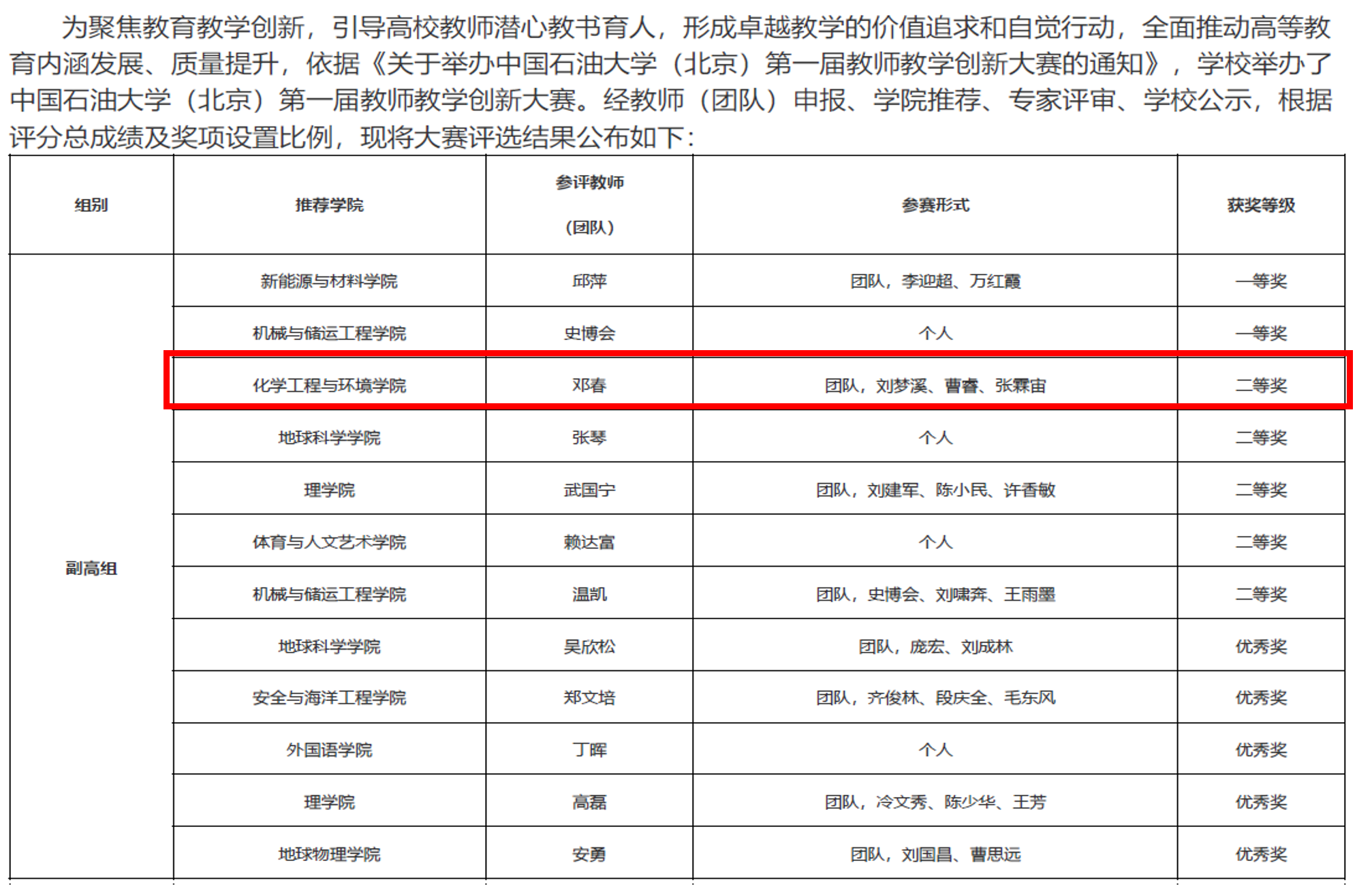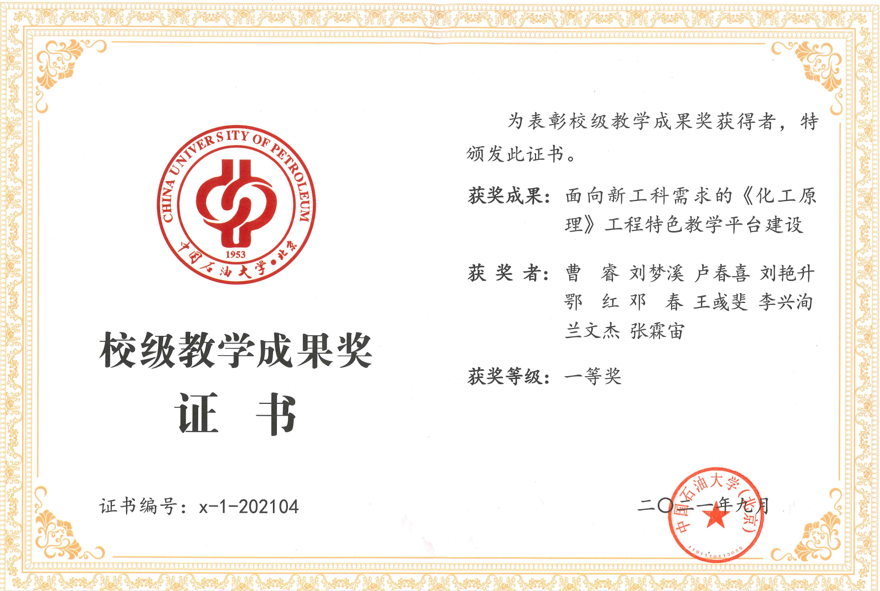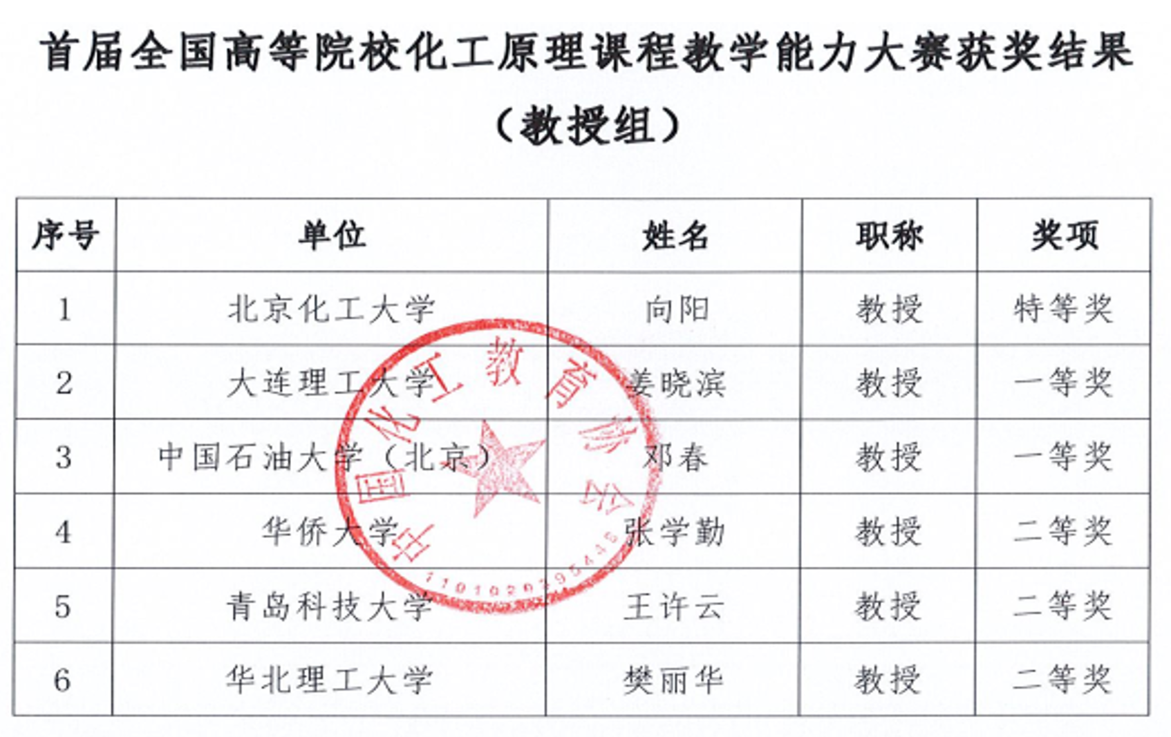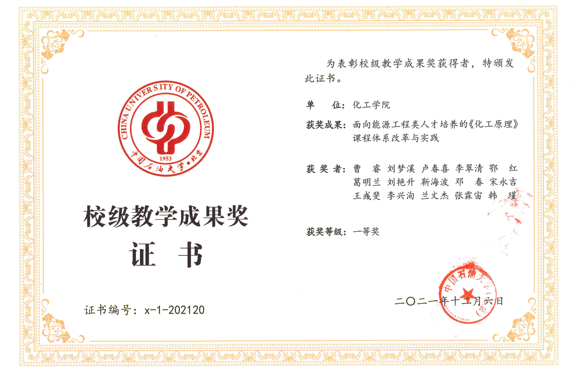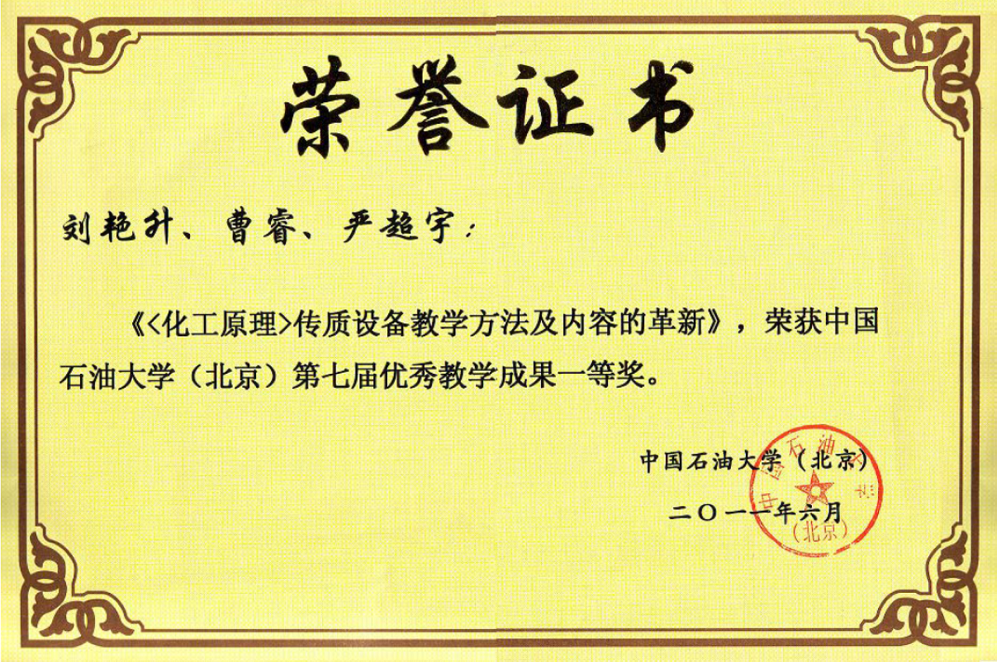 获得全国高校化工原理教学能力大赛特等奖1项、一等奖1项,省部级教学奖8项、校级教学成果奖9项,校教学卓越奖1项,校青年教师卓越奖1项。承担25项教改课题(8项省部级),发表13篇教改论文。