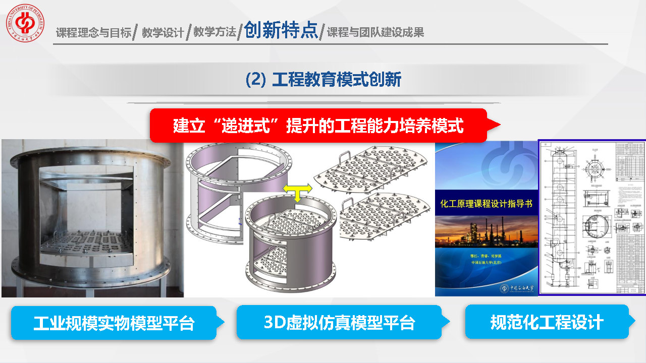 新课程体系集《认识实习》、《课堂教学》、《实验教学》、《课程设计》、“工程特色实训”于一体,可以“精准设计”各环节以实现工程能力的循序提升。特别是“工程特色实训平台”,由中国石油大学(北京)和北京石油化工学院合作共建,架起了一座从课堂教学到现场生产的桥梁。