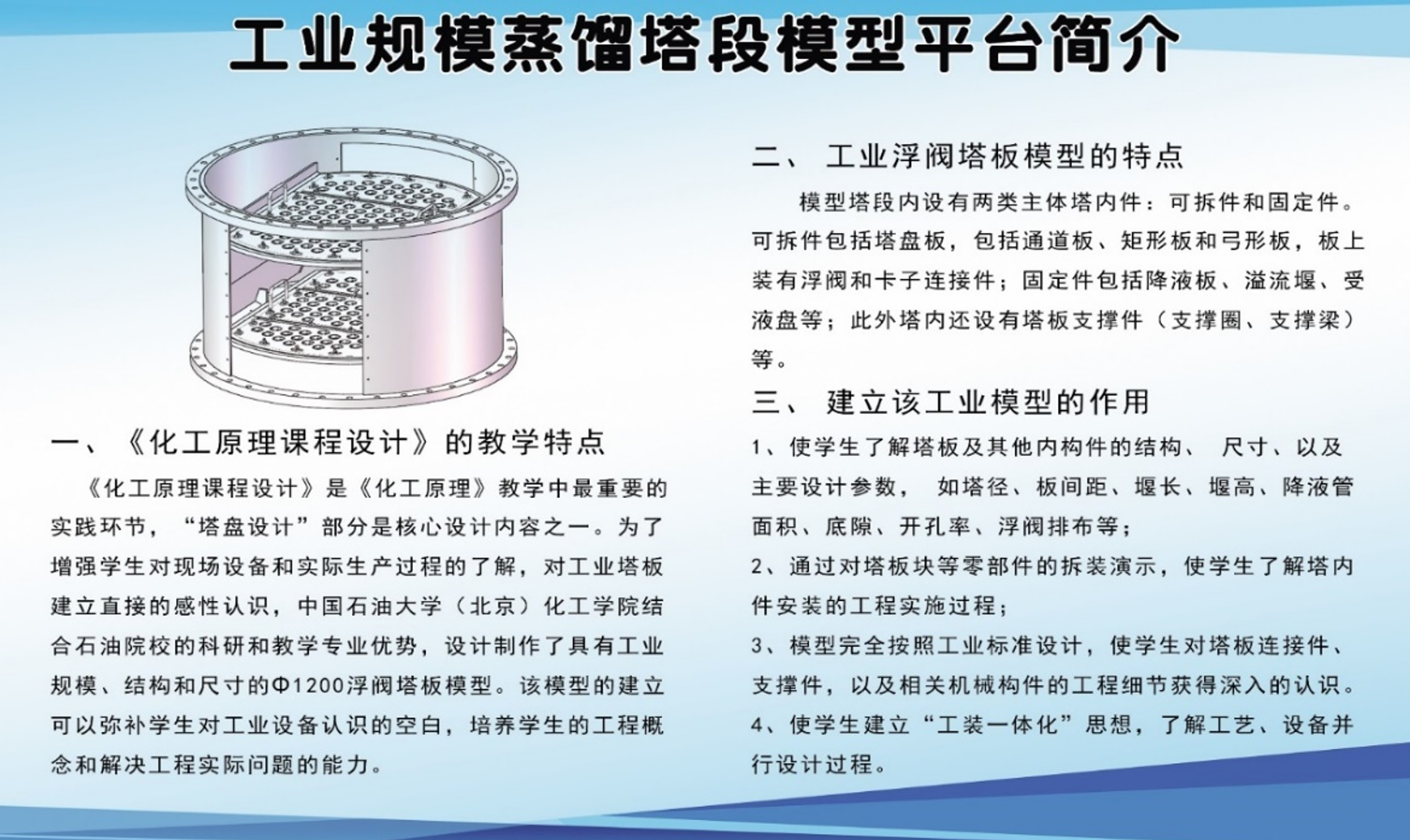 “工业规模实物装置”得到教指委专家天津大学张凤宝教授和河北科技大学赵地顺教授的高度评价。超大型精馏塔是全国最大的冷态实验塔,多功能撬装流化床和焦化流化床是国家奖转化的重要教学成果,空气/乙醇吸收系统属综合教学工程实训。全塔负荷性能图技术是省部级科研获奖成果,用于教学尚属首创。工程仿真软件的应用与生产培训接近,可助力向企业生产快速过渡。工程实训平台成为近十年“北京市大学生化工原理竞赛”强有力的支撑。