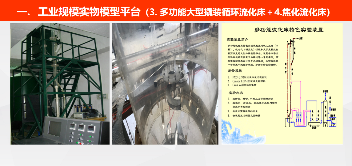 ③ Φ100×6000mm大型撬装多功能循环流化床:配备颗粒速度密度测量仪等先进仪器,可开展探索性工程实验。