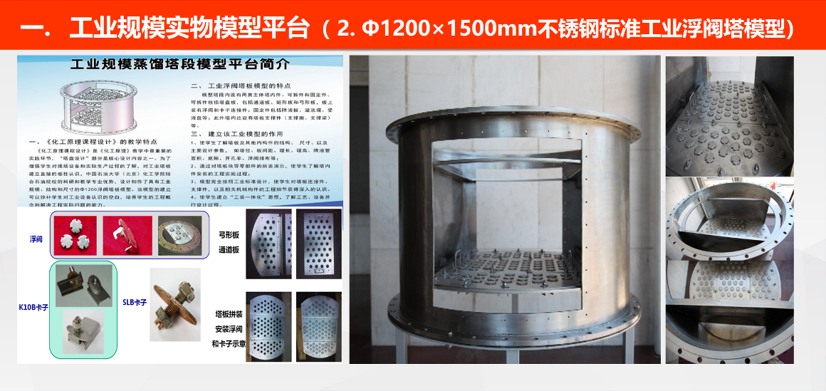 ② Φ1200×1500mm工业规模浮阀塔:完全按工业标准设计制造,极适合设备结构教学和拆装演示。