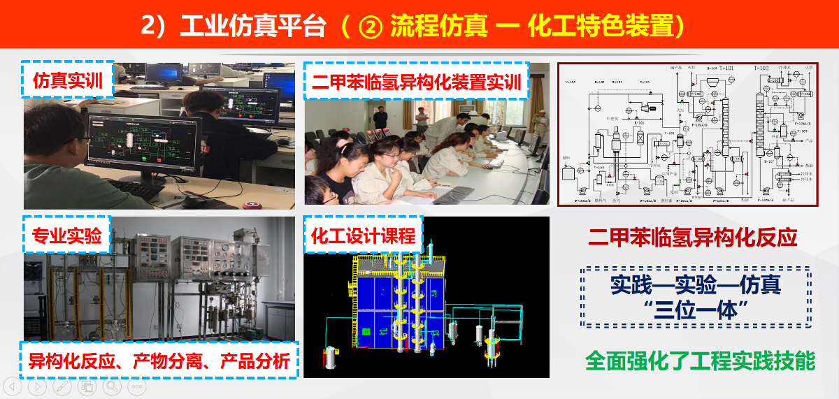 ② 工业流程仿真:对常减压蒸馏、催化裂化等炼油特色装置和二甲苯临氢异构化反应等化工特色装置仿真训练,掌握典型工艺,熟悉单元设备及DCS控制系统,是实物教学的必要补充。