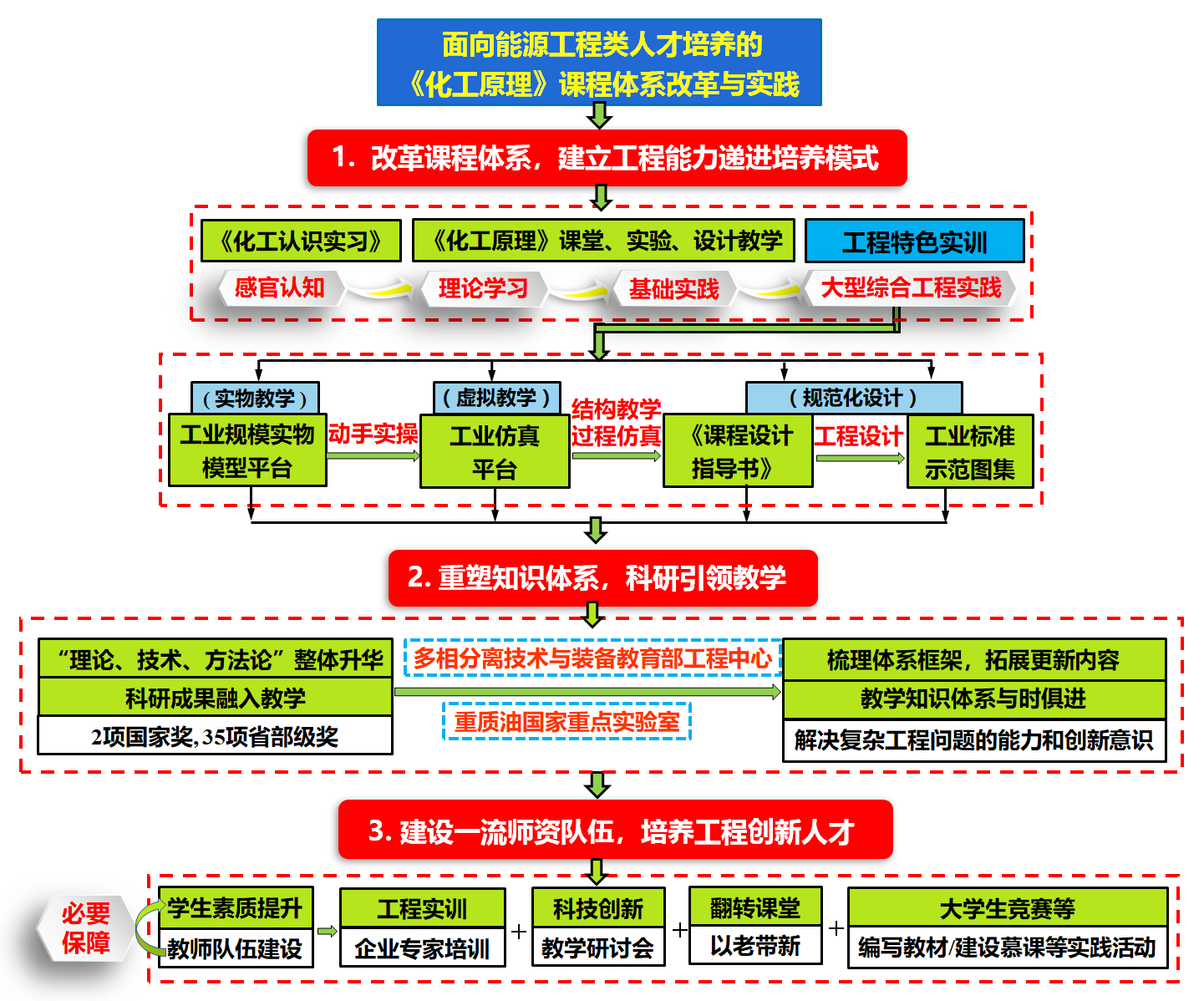 从“场-流”理论、“相控制”理论高度重新认识单元过程本质和传递普遍规律,使学生获取一流学科知识。将科研成果(2项国家奖、35项省部级奖)转化为精馏及塔器、流态化及气固分离、热集成等教学模块,以VQS高效快分、组合汽提等最新专业技术充实教学内容。此外,还将“工装一体化”思想和解决工程放大的“相似论”等研究方法论以及类比、演绎等学习方法论引入教学。通过树立前瞻性科学思想、吸收创新性的实用工程技术,实现了知识体系的整体升华。
