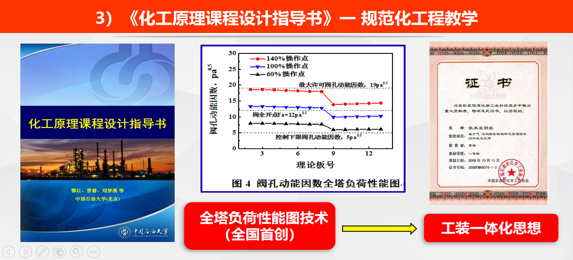 ① 编写了极具石油化工特色的《课程设计指导书》,增加了全塔负荷性能图、Aspen plus工艺模拟、物性数据库等内容。全塔负荷性能图是省部级科研奖励的重要成果,首次用于教学,通过瓶颈分析和多方案对比可帮助学生向工业设计过渡。