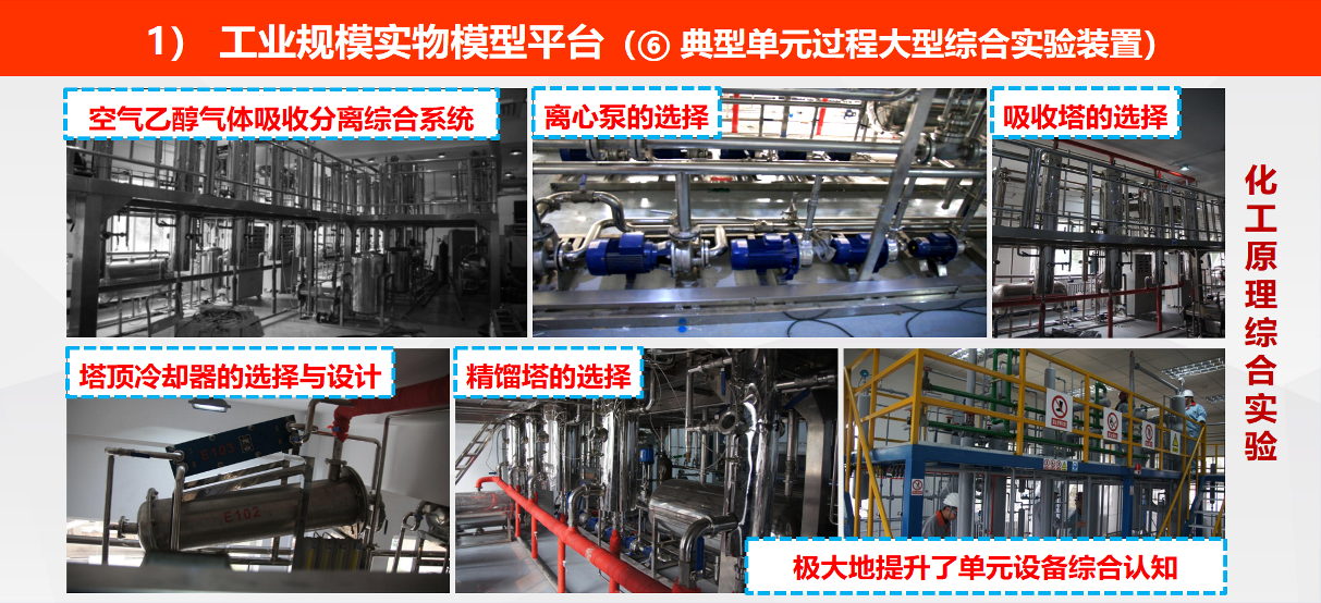 ⑥ 单元过程大型综合实验装置:包括空气-乙醇气体吸收特色综合系统以及包含多个单元的大型综合实验装置,提升了对多单元协同耦合的综合认知。