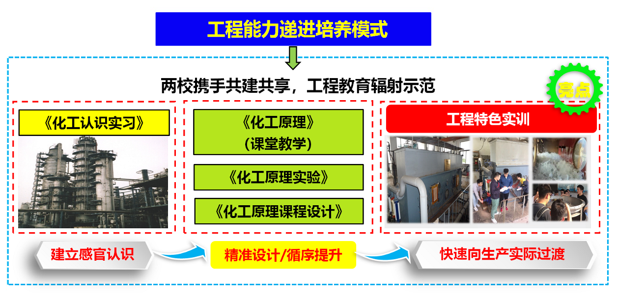 工程能力培养是一个系统工程,需要循序渐进。《认识实习》为后续单元过程原理和设备学习打下坚实基础。“工程特色实训”包括三部分:大型综合实物装置特点鲜明,分别针对工程放大、能源高效利用、环境治理等;工业仿真使复杂抽象的设备教学和工艺模拟简单直观;规范化设计实现了工程能力的实际演练。能使学生从课堂教学快速向生产实际过渡。