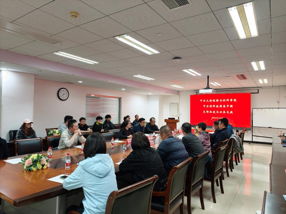 为深化党建引领作用,推动党建与业务深度融合,2026年4月9日下午,中国石油大学(北京)新能源与材料学院功能材料科学方向教工党支部、油气装备材料工程方向教工党支部,与中关村科技园昌平园第一党支部联合开展“党建引领聚合力,产教融合促创新”主题联学共建与业务交流活动。活动在主楼A417会议室举行,新能源与材料学院党委书记陆雅莉、中关村科技园昌平园工委委员、工会主席钮亚敏、中国石油大学(北京)国资处副处长、校办企业副总经理李叶青,以及双方业务骨干、党员代表共40余人参加。