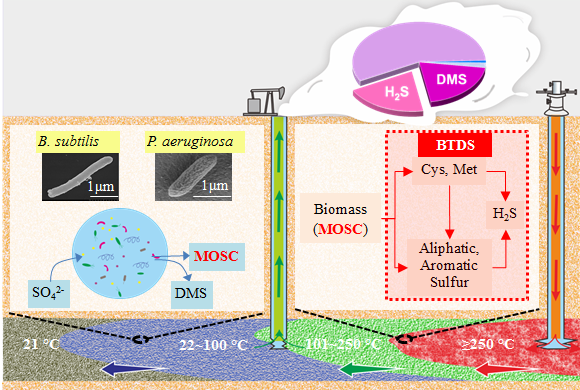 研究选取油藏常见菌种纤细竿菌(革兰氏阳性)和铜绿假单胞菌(革兰氏阴性),模拟蒸汽腔高温环境(250~350℃)下的BTDS过程。结果显示36%的微生物有机硫(MOSC)在高温下转化为H₂S,同时释放甲硫醇等挥发性硫化物(VSCs)。油田采出气中H₂S硫同位素和二甲基硫醚(DMS),进一步证明BTDS是sH₂S主要来源。另见《多温度热劈气相色谱:一种快速鉴别微生物的方法》https://cup.edu.cn/dwzx/xwdt/cg/14f1057f2789415aad9b877649067a66.htm