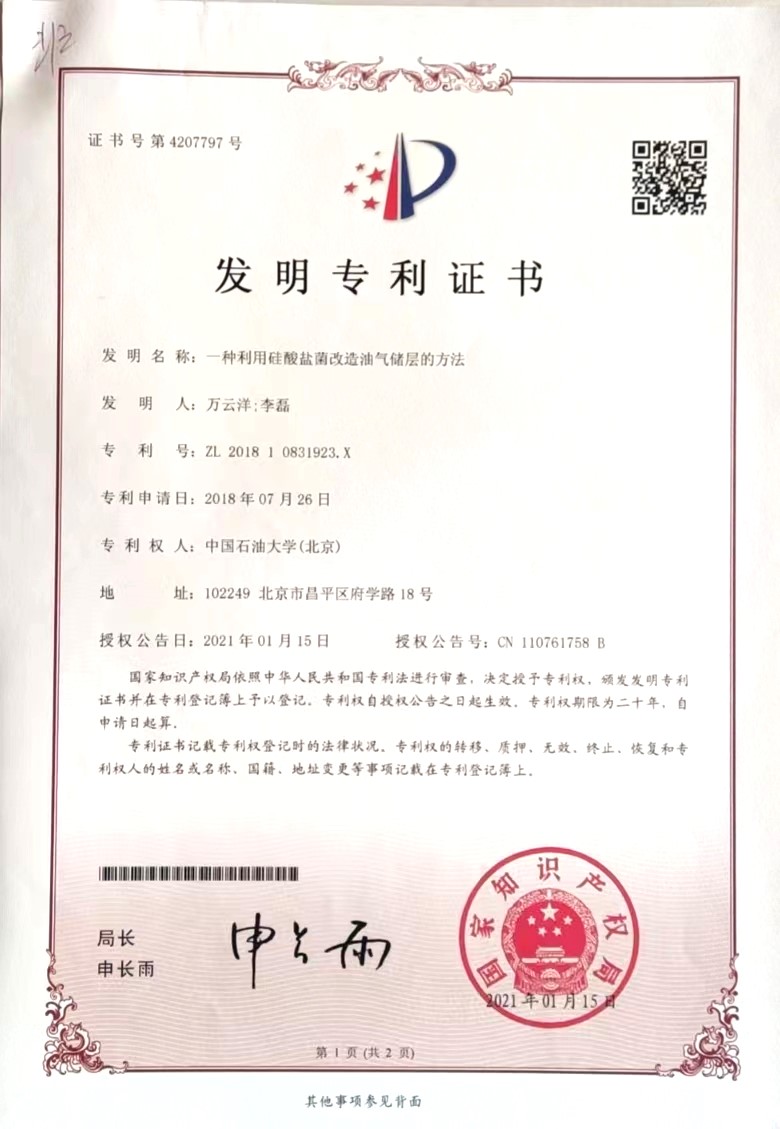 微生物地质学实验室万云洋团队在利用硅酸盐菌改造油气储层方面取得进展,《一种利用硅酸盐菌改造油气储层的方法》发明专利获得国家知识产权局批准,授权专利号为ZL201810831923.X,证书号为第4207797号。