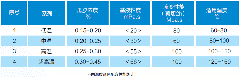 通过优选配伍的辅助添加剂,形成了低温、中温、高温及超高温四种温度系列的低浓度瓜胶压裂液体系,能够满足60-160℃储层温度应用,胍胶浓度由常规体系的0.4-0.6% 降至0.15-0.45%,从而降低了压裂液损害,并控制了压裂液成本。
