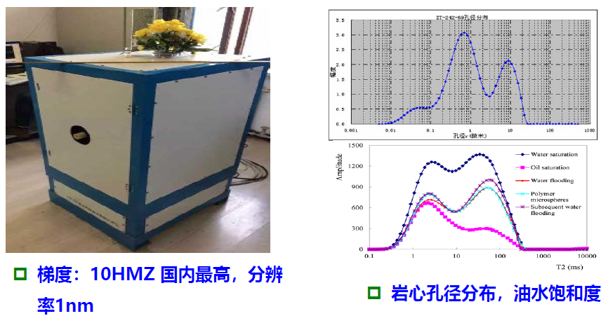 2.核磁共振渗流实验分析系统,测储层物性参数;成像分析,得到驱替过程中岩心内流体直观分布图及扩散系数,岩心中裂缝、溶洞等分布图;高温高压状态下驱替实验的核磁共振动态分析;二维谱的测量、测得驱替过程中岩心内流体的动态统计分布。