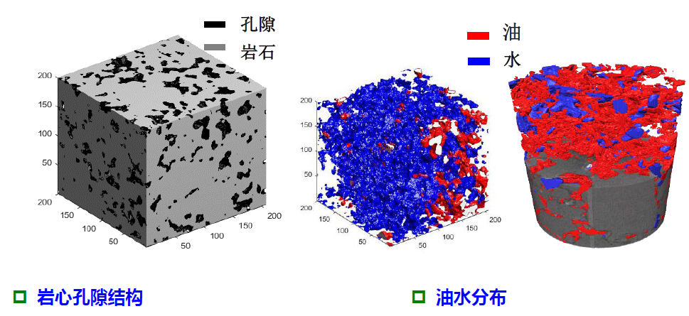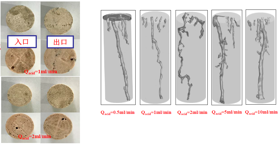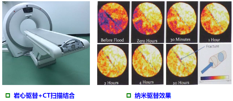 1.CT扫描系统,结合岩心驱替,可以实时测得岩心的油水饱和度的变化,研究纳米乳液等的排驱效果;与酸化结合,可以定量描述酸蚀蚯蚓洞的形态,研究酸化酸压工艺并优选酸液体系;结合CO2驱替,研究CO2提高非常规油气采收率的机制。