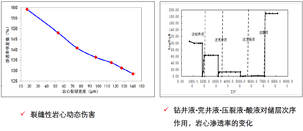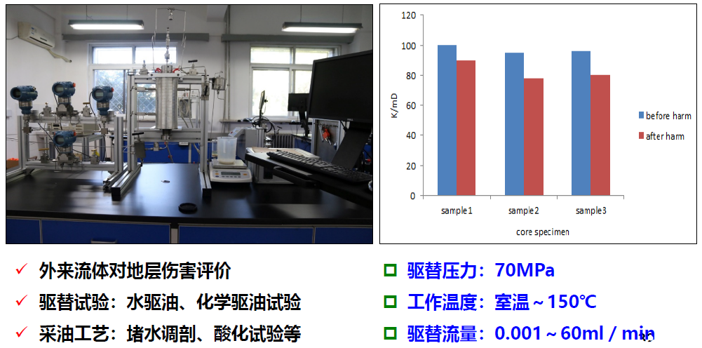 1.模拟储层温度、压力条件下,测定储层岩心的渗透率,研究储层的速敏、盐敏、水敏、碱敏、酸敏、应力敏,各种入井流体对储层的伤害、滤失情况。