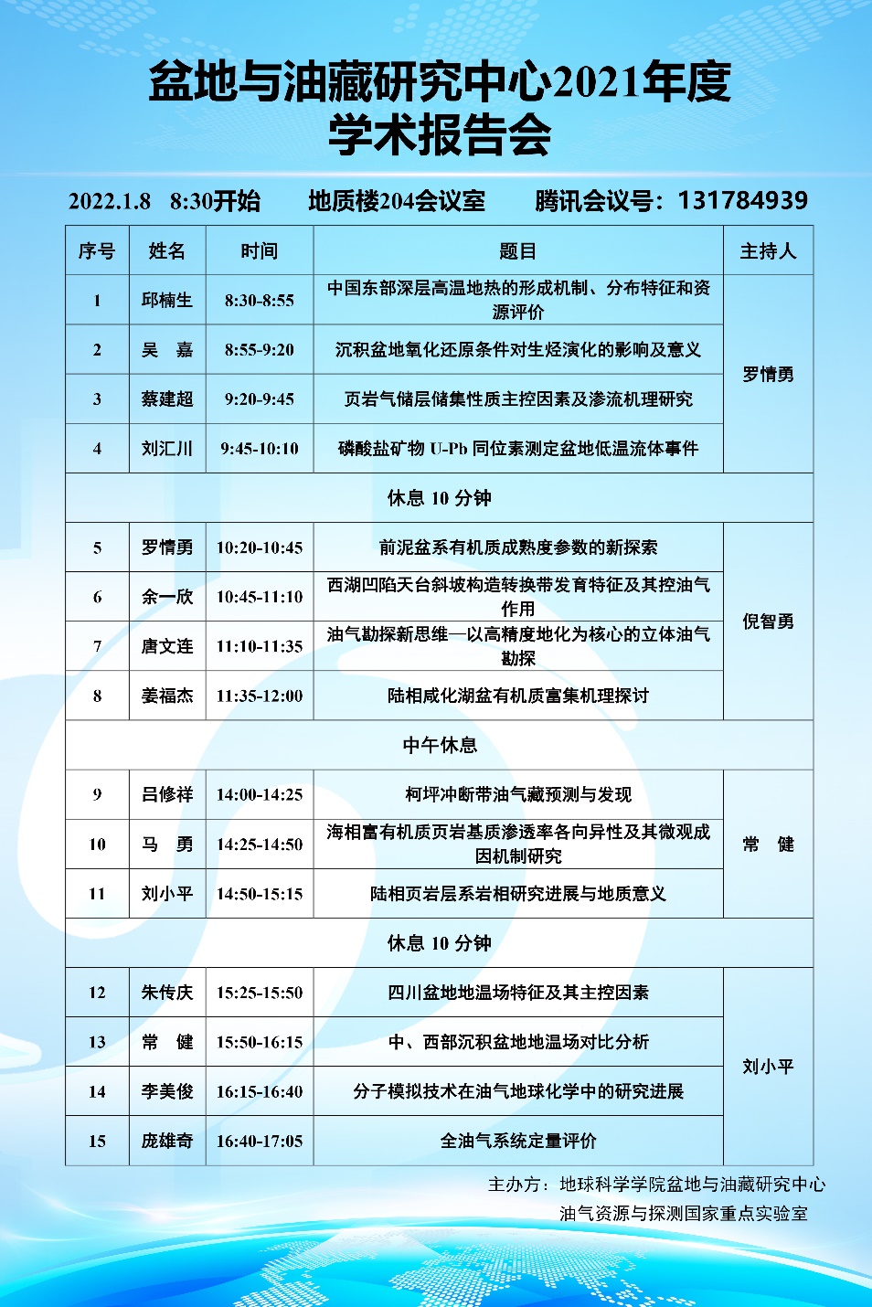 2022年1月8日,地球科学学院盆地与油藏研究中心成功举办2021年度学术年会,会议在线下(地质楼204会议室)和线上(腾讯会议131-784-939)同步进行,共吸引200多位师生参与。