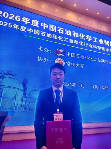 近日,2026年度中国石油和化学工业智能化发展大会暨2025年度中国石油和化工自动化行业科学技术奖与专利奖颁奖大会在江苏常州召开,我院教师孙晨皓荣获青年科技奖,以表彰其在复杂油气藏流体界面力学理论及应用方面做出的突出贡献。