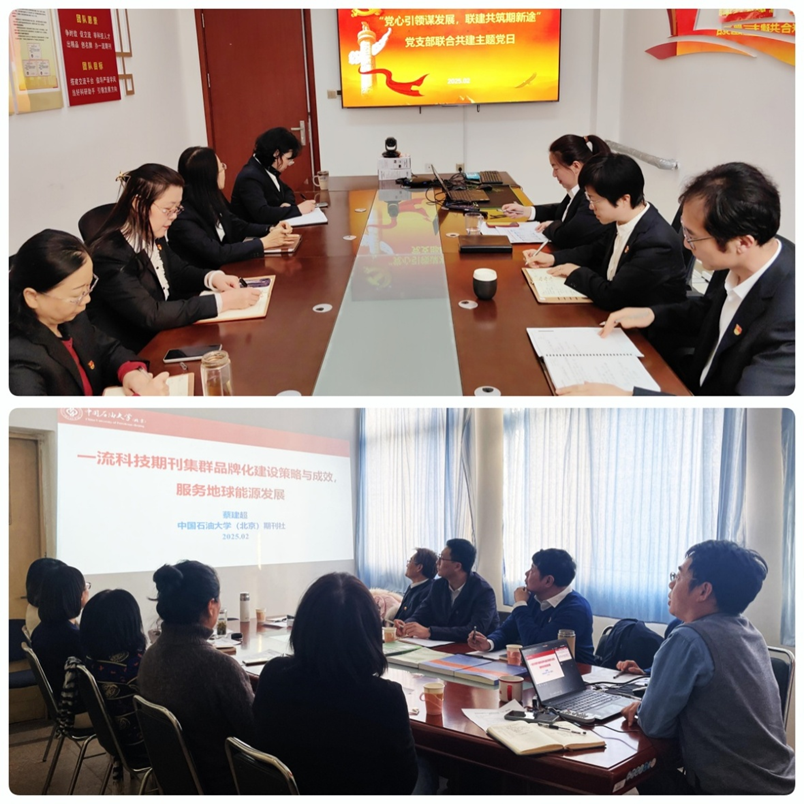 2025年2月18日,胜利油田勘探开发研究院首席专家、《油气地质与采收率》期刊社经理季岩峰带队到中国石油大学(北京)期刊社交流。在209会议室,期刊社与来访的《油气地质与采收率》期刊社成员开展了党支部联合共建主题党日活动。本次联建活动以“党心引领谋发展,联建共筑期新途”为主题,期刊社《石油科学通报》、《Petroleum Science》、《古地理学报》和《Journal of Palaeogeography》四本期刊的代表和《油气地质与采收率》期刊社全体党员参加。此次活动采用线上和线下相结合的方式,由期刊社副主任蔡建超教授主持。