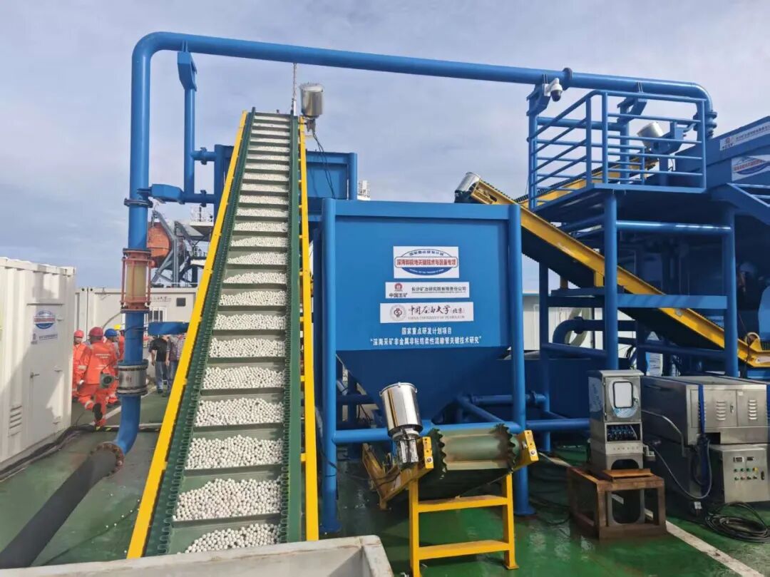 本次非金属柔性混输管的海试由长沙矿冶研究院有限责任公司作为海试牵头单位与总指挥单位,从10月9日开始码头安装调试,27日由广州码头启航至三亚海域,并于31日完成柔性管道海上安全布放回收与全部试验任务,试验区水深103m,非金属非粘结智能柔性管总长250m,首次验证了我国深海采矿全软管输送性能、管体水下空间构型与阻塞的实时健康监测能力,试验中矿浆最大输送体积浓度达15%,矿石粒径20mm,稳定输送流量为457m3/h,实现了设计水深6000m级深海采矿非金属智能柔性管从设计方法、关键超耐磨材料研发、加工工艺与核心制造装备,以及海试评价从“0”到“1”的技术突破,取得了从技术探索迈向海试验证的胜利,为我国6000m级深海多金属结核采矿输送系统的联动海试提供了核心关键技术与装备。