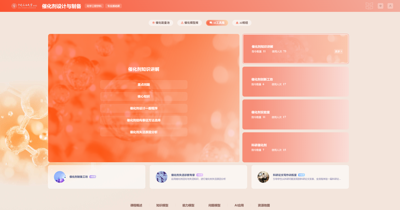 2025年11月5日,这门由中石大化学工程与环境学院教授吴志杰主讲的课程“催化剂设计与制备”,从全国162门申报课程中脱颖而出,入选中国学位与研究生教育学会评定的21门“AI创新课程”。