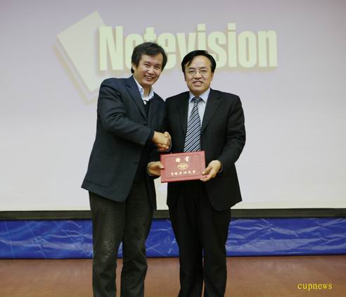 当天晚上,黄鸣先生在张来斌校长的陪同下,满怀激情地登上了翠宫二楼报告厅的讲台。在讲坛开始之前,黄鸣先生接受了张来斌校长为他颁发的“荣誉教授”证书,全场响起热烈掌声。