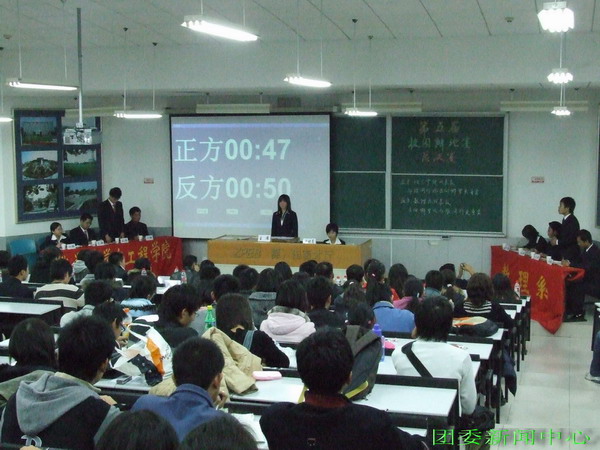 由校团委主办校学生会承办的我校第五届校园辩论赛决赛于11月21日晚在三教中原油田育才厅举行。校团委老师杜书成、谢君和校学生会社团联合会团委新闻中心及中国政法大学和化工大学代表应邀观看了决赛。此次对决的双方是化学科学与工程学院代表队和数理系代表队。双方就“与谁同行和去向哪里更重要”进行了激烈的辩论。最终化工学院代表队技高一筹战胜数理系代表队捧得桂冠。
