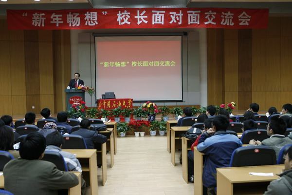 12月20日晚7:00,由校学生会、校研究生会、校社团联合会主办的“新年畅想”校长面对面交流会在翠宫二楼报告厅举行。张来斌校长莅临现场做精彩演讲,向同学们介绍学校2007年的工作并展望了学校今后的发展。