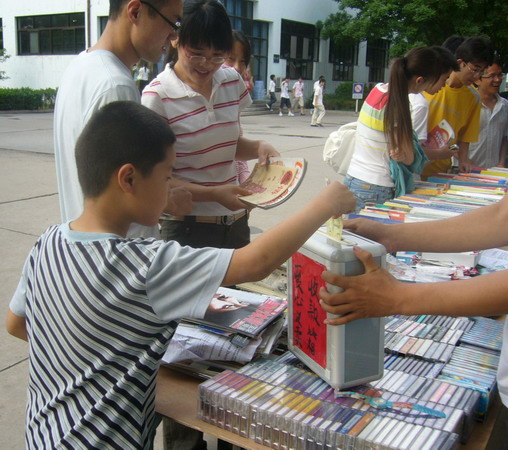 由学生工作处主办、物品捐赠中心具体实施的“支援灾区,温暖中国”大型爱心义卖活动今天下午6:00在一餐门前落下帷幕。此次活动分为“物品捐赠”和“爱心义卖”两个部分,不接受钱款捐赠,以书本及生活用品为主,5月29日、30日在学校一餐、润杰、阳光公寓举行了捐赠活动,所捐物品主要有衣服、书本、杂志、电子产品、笔、笔芯、磁带、水杯等。义卖时间是6月1日、2日,分别在润杰西门和学校一餐门前举行。