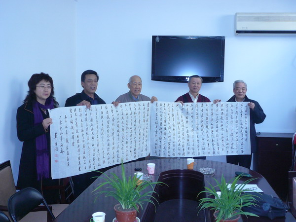 在学校关心下一代工作委员会的领导和支持下,在主管校领导的关怀下,我校老年书画社15位老同志历时近半年时间,辛勤耕耘,创作了8个大幅、128幅斗方的书法绘画作品,用于我校研究生阳光公寓学生宿舍楼的装饰。3月13日下午,在离退休工作处的配合下,在石油大院离退休工作处会议室举行了老年书画社向后勤服务总公司捐赠书法绘画作品仪式。