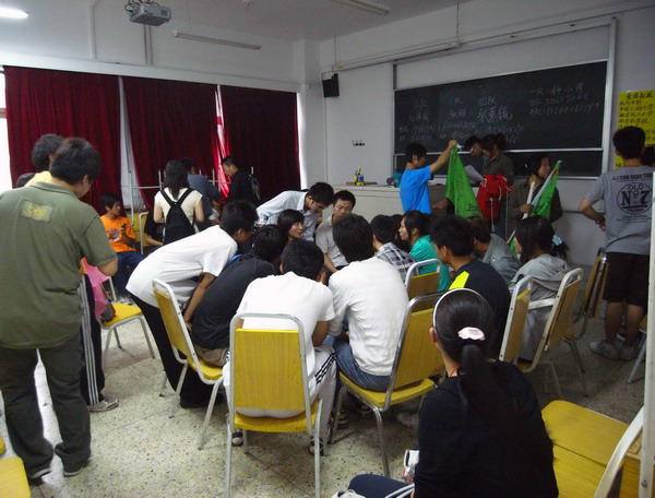 随着207、208教室《我相信》歌曲的响起,活动正式开始。每个教室的主持人先向同学们介绍了扩展活动的历史与意义,并激发起同学们参加活动的热情,随后将同学分为16个团队,让同学们自己进行了团队建设。在南门小广场,拓展师带领同学开展进行了盲眼和电网两个室外项目。在第二教学楼中,同学们进行了领袖风采的活动环节。