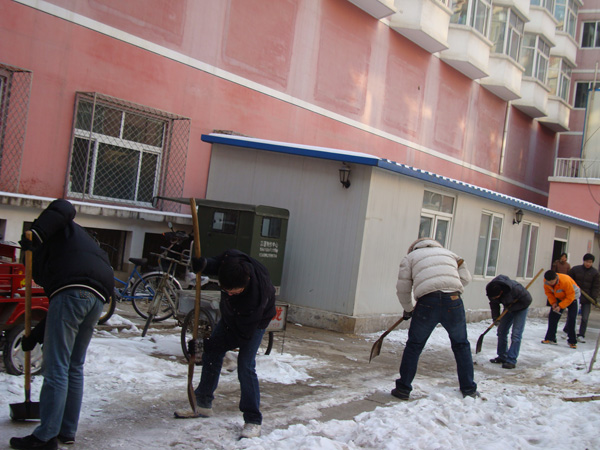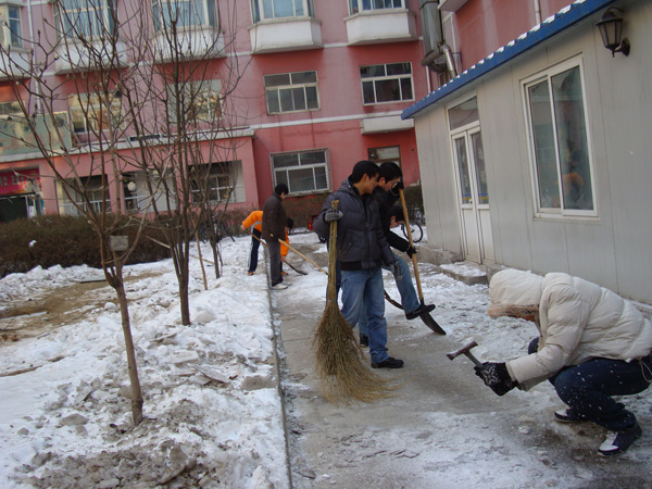 14日一早,工商本06-3党支部的七名党员带着铁锹和扫帚等工具在润杰公寓2号楼下集合,开始了铲冰行动。在零下十几度的天气里,几名党员不顾严寒,本着为全校师生服务的热情,投入到了艰难的铲冰活动中。经过近两个小时的忙碌,工商本06-3党支部在开水房附近清理出了一条无冰的道路。