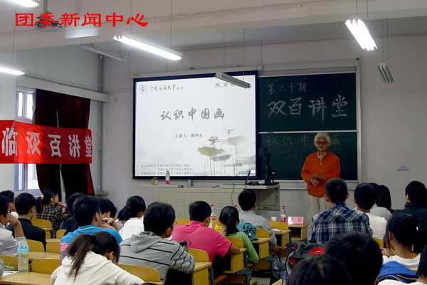 9月21日下午,中国书画家联谊会理事、中国王羲之基金会学术委员郭钟永先生应邀做客石大第六十期“双百讲堂”。郭先生以“认识中国画”为题为石大学子作了一场精彩报告。