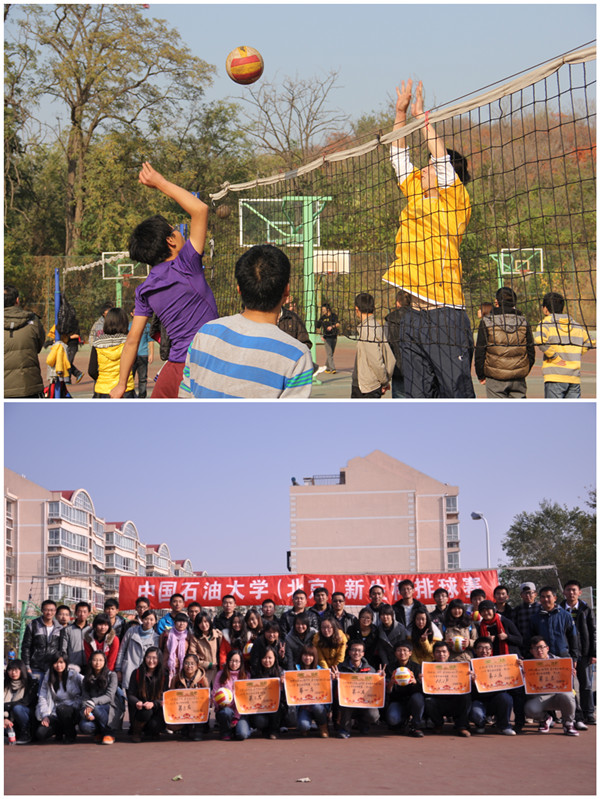 11月7日,中国石油大学2012年度新生杯排球联赛经过为期9天的激烈角逐圆满落下帷幕。地球物理与信息工程学院、石油工程学院和机械与储运工程学院分列男组前三名,而女队的冠、亚、季军分别由机械与储运工程学院、化学工程学院和地球物理与信息工程学院获得。男子组的陈明旭同学与女子组的谢茹梦同学获得本年度比赛的“MVP”称号。